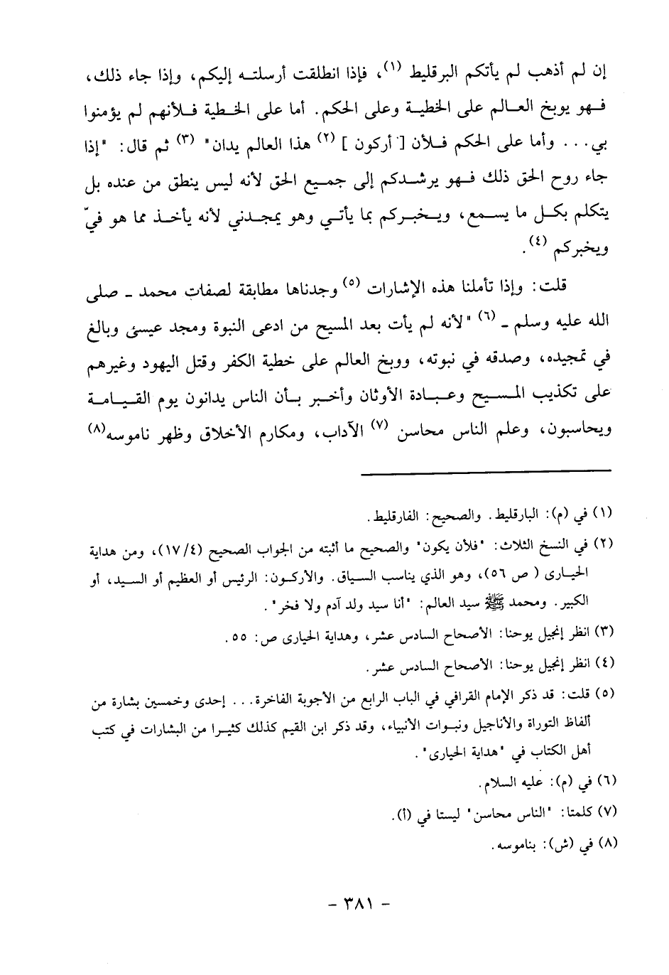 (5) قلت: قد ذكر الإمام القرافي في الباب الرابع من الأجوبة الفاخرة ... إحدى وخمسين بشارة من ألفاظ التوراة والأناجيل ونبوات الأنبياء، وقد ذكر ابن القيم كذلك كثيرا من البشارات في كتب أهل الكتاب في" هداية الحيارى".