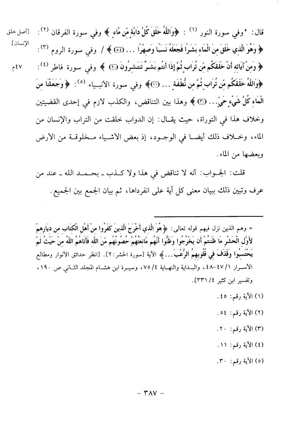 وَاللَّهُ خَلَقَكُمْ مِنْ تُرابٍ ثُمَّ مِنْ نُطْفَةٍ ... (11) وفي سورة الأنبياء «5»: وجَعَلْنا مِنَ الْماءِ كُلَّ شَيْءٍ حَيٍّ ... (30) وهذا بين التناقض، والكذب لازم في إحدى القضيتين وخلاف هذا في التوراة، حيث يقال: إن الدواب خلقت من التراب والإنسان من الماء، وخلاف ذلك أيضا في الوجود، إذ بعض الأشياء مخلوقة من الأرض وبعضها من الماء.