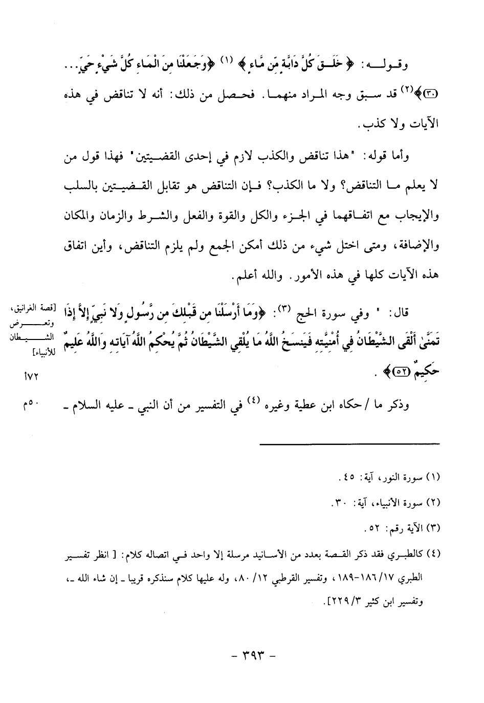 قال:" وفي سورة الحج «3»: وما أَرْسَلْنا مِنْ قَبْلِكَ مِنْ رَسُولٍ ولا نَبِيٍّ إِلَّا إِذا تَمَنَّى أَلْقَى الشَّيْطانُ فِي أُمْنِيَّتِهِ فَيَنْسَخُ اللَّهُ ما يُلْقِي الشَّيْطانُ ثُمَّ يُحْكِمُ اللَّهُ آياتِهِ واللَّهُ عَلِيمٌ حَكِيمٌ (52).