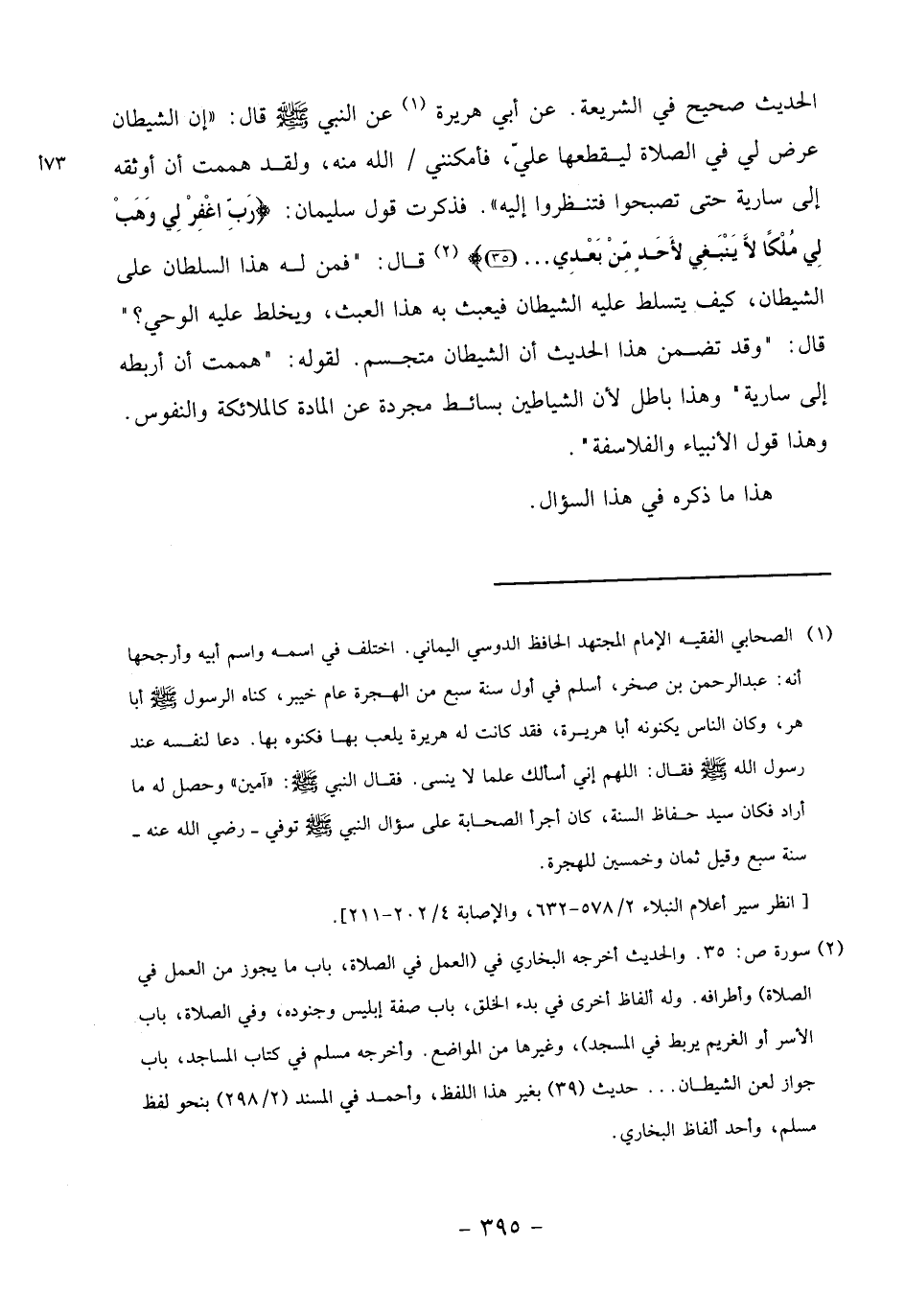 الحديث صحيح في الشريعة. عن أبي هريرة «1» عن النبي صلّى الله عليه وسلّم قال: «إن الشيطان عرض لي في الصلاة ليقطعها عليّ، فأمكنني/ الله منه، ولقد هممت أن أوثقه إلى سارية حتى تصبحوا فتنظروا إليه». فذكرت قول سليمان: رَبِّ اغْفِرْ لِي وهَبْ لِي مُلْكاً لا يَنْبَغِي لِأَحَدٍ مِنْ بَعْدِي ... (35) «2» قال:" فمن له هذا السلطان على الشيطان، كيف يتسلط عليه الشيطان فيعبث به هذا العبث، ويخلط عليه الوحي؟ " قال:" وقد تضمن هذا الحديث أن الشيطان متجسم. لقوله:" هممت أن أربطه إلى سارية" وهذا باطل لأن الشياطين بسائط مجردة عن المادة كالملائكة والنفوس.