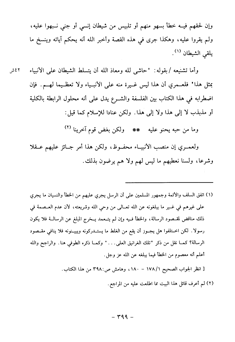 (1) اتفق السلف والأئمة وجمهور المسلمين على أن الرسل يجري عليهم من الخطأ والنسيان ما يجري على غيرهم في غير ما يبلغونه عن الله تعالى من وحي الله وشريعته، لأن عدم العصمة في ذلك مناقض لمقصود الرسالة، والخطأ فيه وإن لم يتعمد يخرج المبلغ عن الرسالة فلا يكون رسولا. لكن اختلفوا هل يجوز أن يقع من الغلط ما يستدركونه ويبينونه فلا ينافي مقصود الرسالة؟ كما نقل من ذكر" تلك الغرانيق العلى ... " وكما ذكره الطوفي هنا. والراجح والله أعلم أنه معصوم من الخطأ فيما يبلغه عن الله عز وجل.