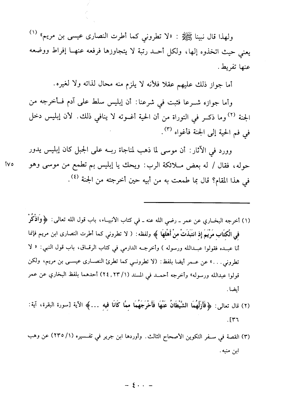 (1) أخرجه البخاري عن عمر- رضي الله عنه- في كتاب الأنبياء، باب قول الله تعالى: واذْكُرْ فِي الْكِتابِ مَرْيَمَ إِذِ انْتَبَذَتْ مِنْ أَهْلِها ولفظه: (لا تطروني كما أطرت النصارى ابن مريم فإنما أنا عبده فقولوا عبد الله ورسوله) وأخرجه الدارمي في كتاب الرقاق، باب قول النبي: «لا تطروني ... » عن عمر أيضا بلفظ: (لا تطروني كما تطرأ النصارى عيسى بن مريم، ولكن قولوا عبد الله ورسوله» وأخرجه أحمد في المسند (1/ 23، 24) أحدهما بلفظ البخاري عن عمر أيضا.