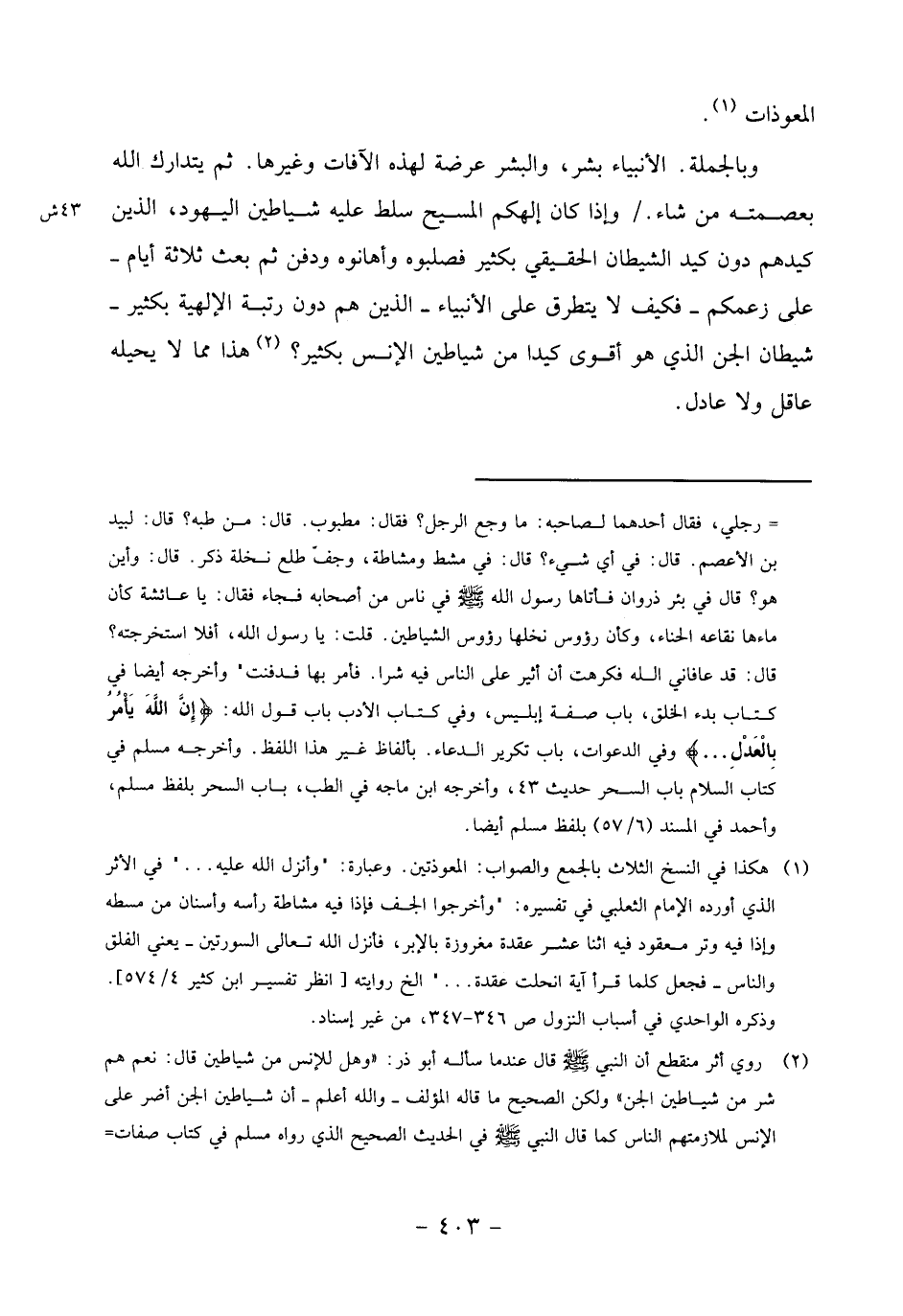وبالجملة. الأنبياء بشر، والبشر عرضة لهذه الآفات وغيرها. ثم يتدارك الله بعصمته من شاء./ وإذا كان إلهكم المسيح سلط عليه شياطين اليهود، الذين كيدهم دون كيد الشيطان الحقيقي بكثير فصلبوه وأهانوه ودفن ثم بعث ثلاثة أيام- على زعمكم- فكيف لا يتطرق على الأنبياء- الذين هم دون رتبة الإلهية بكثير- شيطان الجن الذي هو أقوى كيدا من شياطين الإنس بكثير؟ «2» هذا مما لا يحيله عاقل ولا عادل.