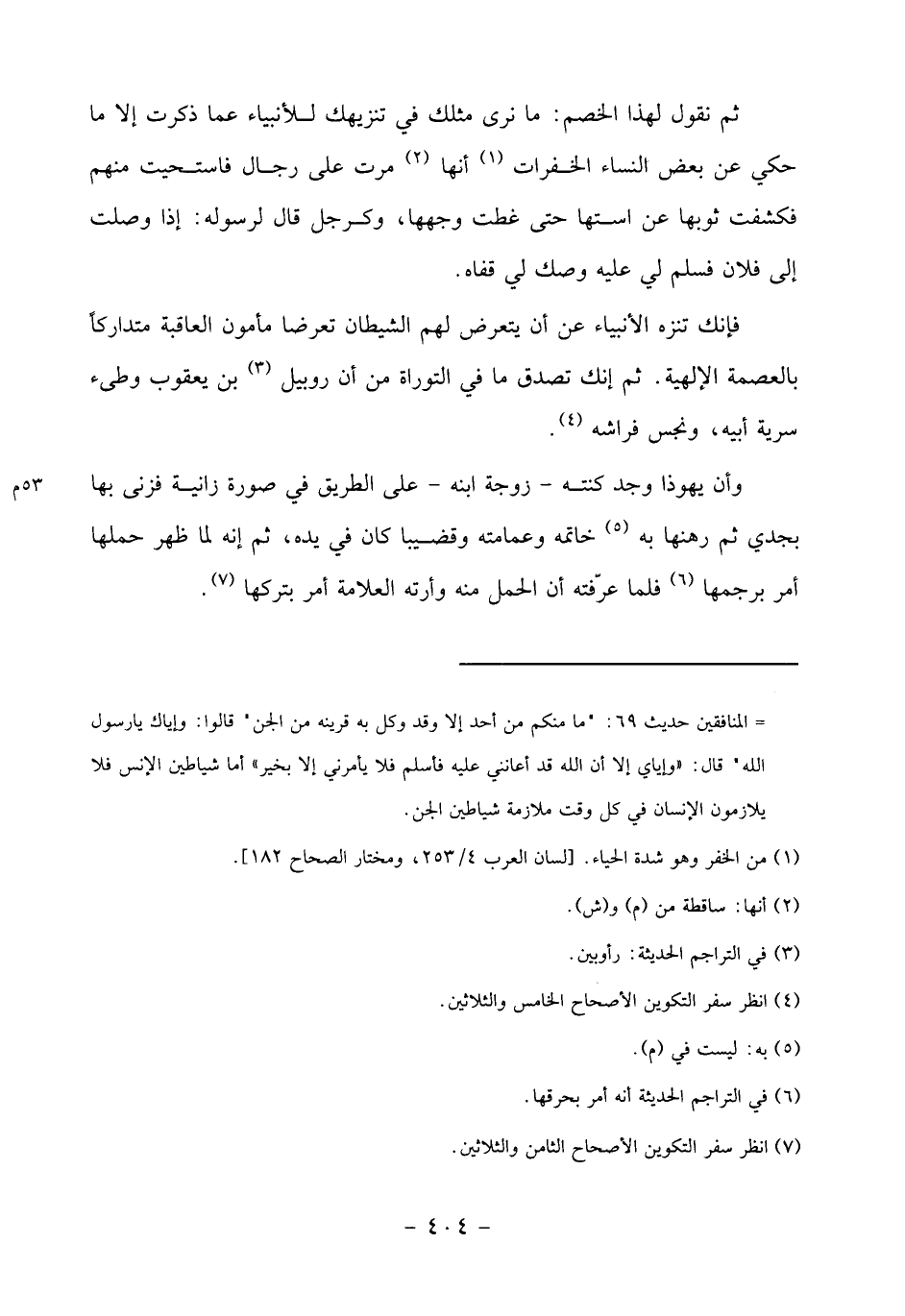 فإنك تنزه الأنبياء عن أن يتعرض لهم الشيطان تعرضا مأمون العاقبة متداركا بالعصمة الإلهية. ثم إنك تصدق ما في التوراة من أن روبيل «3» بن يعقوب وطئ سرية أبيه، ونجس فراشه «4».