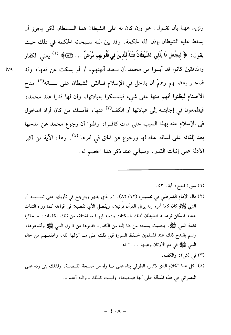 ونزيد هاهنا بأن نقول: هو وإن كان له على الشيطان هذا السلطان لكن يجوز أن يسلط عليه الشيطان بإذن الله لحكمة. وقد بين الله سبحانه الحكمة في ذلك حيث يقول: لِيَجْعَلَ ما يُلْقِي الشَّيْطانُ فِتْنَةً لِلَّذِينَ فِي قُلُوبِهِمْ مَرَضٌ ... (53) «1» يعني الكفار والمنافقين كانوا قد أيسوا من محمد أن يعبد آلهتهم،/ أو يسكت عن ذمها، وقد ضجر بعضهم وهمّ أن يدخل في الإسلام فألقى الشيطان على لسانه «2» مدح الأصنام ليظنوا أنهم منها على شيء فيتمسكوا بعبادتها، وأن لها قدرا عند محمد، فيطمعون في إجابته إلى عبادتها أو الكف «3» عنها، فأمسك من كان أراد الدخول في الإسلام عنه بهذا السبب حتى مات كافرا، وظنوا أن رجوع محمد عن مدحها بعد إلقائه على لسانه عناد لها ورجوع عن الحق في أمرها «4». وهذه الآية من أكبر الأدلة على إثبات القدر. وسيأتي عند ذكر هذا الخصم له.