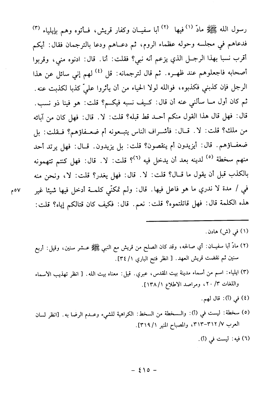 قال: فهل قال هذا القول منكم أحد قط قبله؟ قلت: لا. قال: فهل كان من آبائه من ملك؟ قلت: لا. قال: فأشرف الناس يتبعونه أم ضعفاؤهم؟ فقلت: بل ضعفاؤهم. قال: أيزيدون أم ينقصون؟ قلت: بل يزيدون. قال: فهل يرتد أحد منهم سخطة «5» لدينه بعد أن يدخل فيه «6»؟ قلت: لا. قال: فهل كنتم تتهمونه بالكذب قبل أن يقول ما قال؟ قلت: لا. قال: فهل يغدر؟ قلت: لا، ونحن منه في/ مدة لا ندري ما هو فاعل فيها. قال: ولم تمكّني كلمة أدخل فيها شيئا غير هذه الكلمة قال: فهل قاتلتموه؟ قلت: نعم. قال: فكيف كان قتالكم إياه؟ قلت: