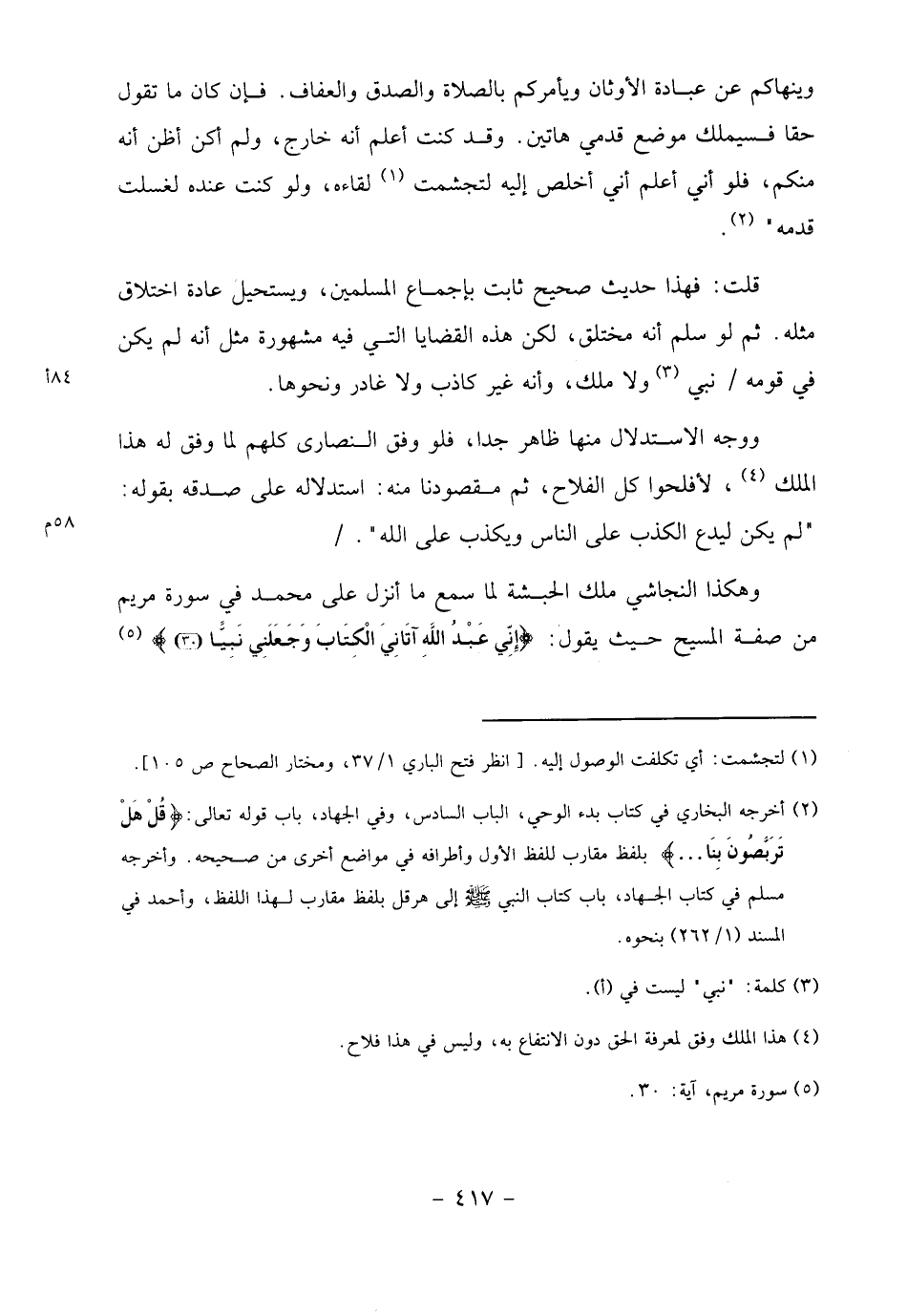 وهكذا النجاشي ملك الحبشة لما سمع ما أنزل على محمد في سورة مريم من صفة المسيح حيث يقول: إِنِّي عَبْدُ اللَّهِ آتانِيَ الْكِتابَ وجَعَلَنِي نَبِيًّا (30) «5»