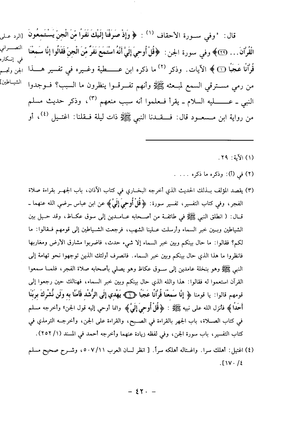 (3) يقصد المؤلف بذلك الحديث الذي أخرجه البخاري في كتاب الآذان، باب الجهر بقراءة صلاة الفجر، وفي كتاب التفسير، تفسير سورة: قُلْ أُوحِيَ إِلَيَ عن ابن عباس- رضي الله عنهما- قال: (انطلق النبي صلّى الله عليه وسلّم في طائفة من أصحابه عامدين إلى سوق عكاظ، وقد حيل بين الشياطين وبين خبر السماء وأرسلت علينا الشهب، فرجعت الشياطين إلى قومهم فقالوا: ما لكم؟ فقالوا: ما حال بينكم وبين خبر السماء إلا شيء حدث، فاضربوا مشارق الأرض ومغاربها فانظروا ما هذا الذي حال بينكم وبين خبر السماء. فانصرف أولئك الذين توجهوا نحو تهامة إلى النبي صلّى الله عليه وسلّم وهو بنخلة عامدين إلى سوق عكاظ وهو يصلي بأصحابه صلاة الفجر، فلما سمعوا القرآن استعموا له فقالوا: هذا والله الذي حال بينكم وبين خبر السماء، فهنالك حين رجعوا إلى قومهم قالوا: يا قومنا إِنَّا سَمِعْنا قُرْآناً عَجَباً (1) يَهْدِي إِلَى الرُّشْدِ فَآمَنَّا بِهِ ولَنْ نُشْرِكَ بِرَبِّنا أَحَداً فأنزل الله على نبيه صلّى الله عليه وسلّم: قُلْ أُوحِيَ إِلَيَ وانما أوحي إليه قول الجن» وأخرجه مسلم في كتاب الصلاة، باب الجهر بالقراءة في الصبح، والقراءة على الجن، وأخرجه الترمذي في كتاب التفسير، باب سورة الجن، وفي لفظه زيادة عنهما وأخرجه أحمد في المسند (1/ 252).