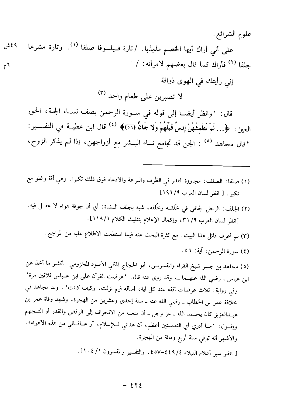 إني رأيتك في الهوى ذواقة لا تصبرين على طعام واحد «3» قال:" وانظر أيضا إلى قوله في سورة الرحمن يصف نساء الجنة، الحور العين: ... لَمْ يَطْمِثْهُنَّ إِنْسٌ قَبْلَهُمْ ولا جَانٌّ (56) «4» قال ابن عطية في التفسير: