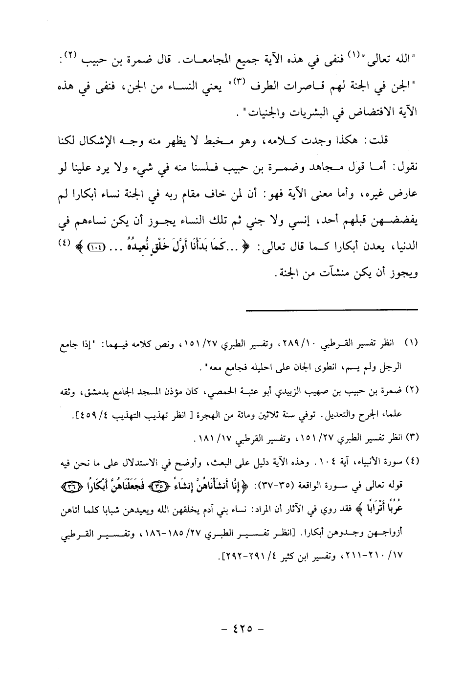 (4) سورة الأنبياء، آية 104. وهذه الآية دليل على البعث، وأوضح في الاستدلال على ما نحن فيه قوله تعالى في سورة الواقعة (35 - 37): إِنَّا أَنْشَأْناهُنَّ إِنْشاءً (35) فَجَعَلْناهُنَّ أَبْكاراً (36) عُرُباً أَتْراباً فقد روي في الآثار أن المراد: نساء بني آدم يخلقهن الله ويعيدهن شبابا كلما أتاهن أزواجهن وجدوهن أبكارا. [انظر تفسير الطبري 27/ 185 - 186، وتفسير القرطبي 17/ 210 - 211، وتفسير ابن كثير 4/ 291 - 292].