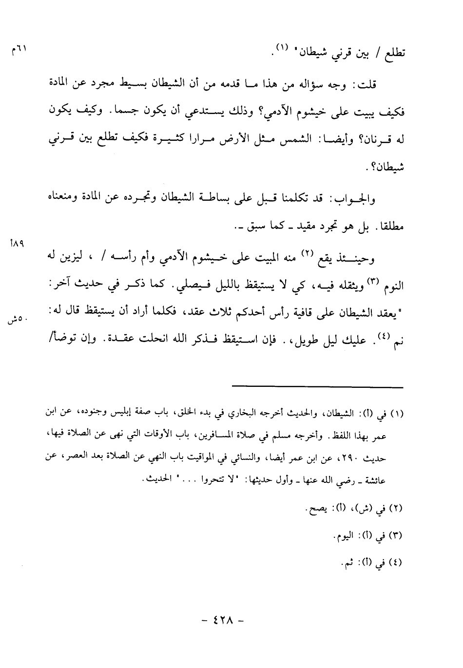 قلت: وجه سؤاله من هذا ما قدمه من أن الشيطان بسيط مجرد عن المادة فكيف يبيت على خيشوم الآدمي؟ وذلك يستدعي أن يكون جسما. وكيف يكون له قرنان؟ وأيضا: الشمس مثل الأرض مرارا كثيرة فكيف تطلع بين قرني شيطان؟.