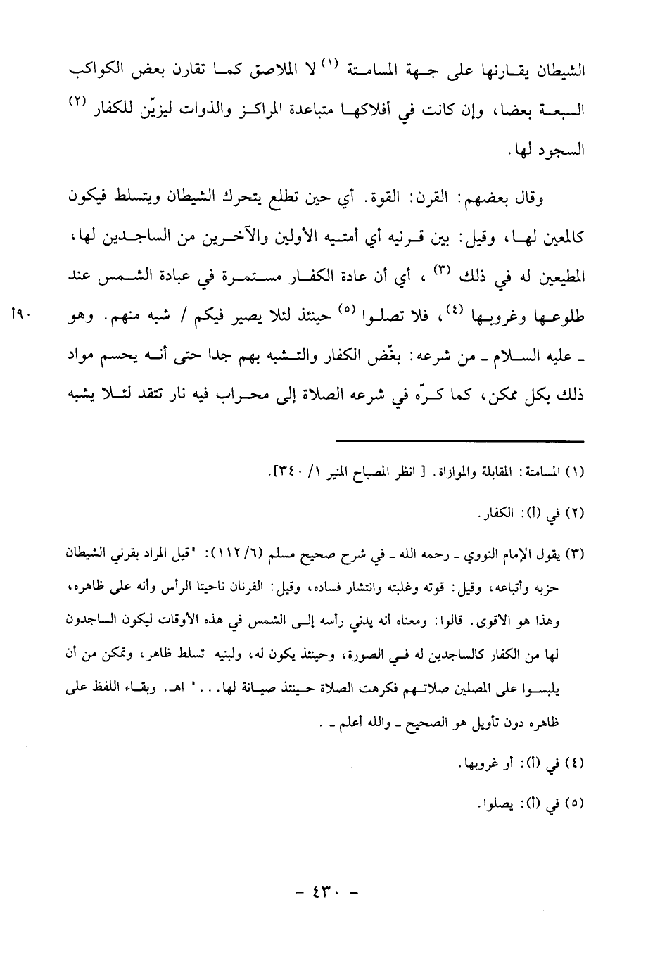 (3) يقول الإمام النووي- رحمه الله- في شرح صحيح مسلم (6/ 112):" قيل المراد بقرني الشيطان حزبه وأتباعه، وقيل: قوته وغلبته وانتشار فساده، وقيل: القرنان ناحيتا الرأس وأنه على ظاهره، وهذا هو الأقوى. قالوا: ومعناه أنه يدني رأسه إلى الشمس في هذه الأوقات ليكون الساجدون لها من الكفار كالساجدين له في الصورة، وحينئذ يكون له، ولبنيه تسلط ظاهر، وتمكن من أن يلبسوا على المصلين صلاتهم فكرهت الصلاة حينئذ صيانة لها ... " اهـ. وبقاء اللفظ على ظاهره دون تأويل هو الصحيح- والله أعلم-.