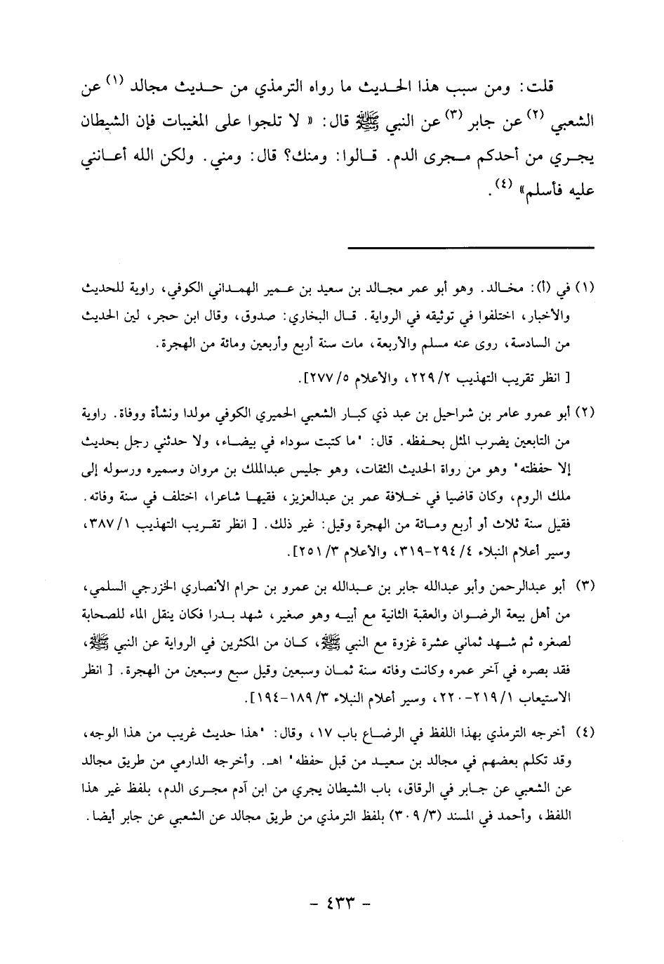 (4) أخرجه الترمذي بهذا اللفظ في الرضاع باب 17، وقال:" هذا حديث غريب من هذا الوجه، وقد تكلم بعضهم في مجالد بن سعيد من قبل حفظه" اهـ. وأخرجه الدارمي من طريق مجالد عن الشعبي عن جابر في الرقاق، باب الشيطان يجري من ابن آدم مجرى الدم، بلفظ غير هذا اللفظ، وأحمد في المسند (3/ 309) بلفظ الترمذي من طريق مجالد عن الشعبي عن جابر أيضا.