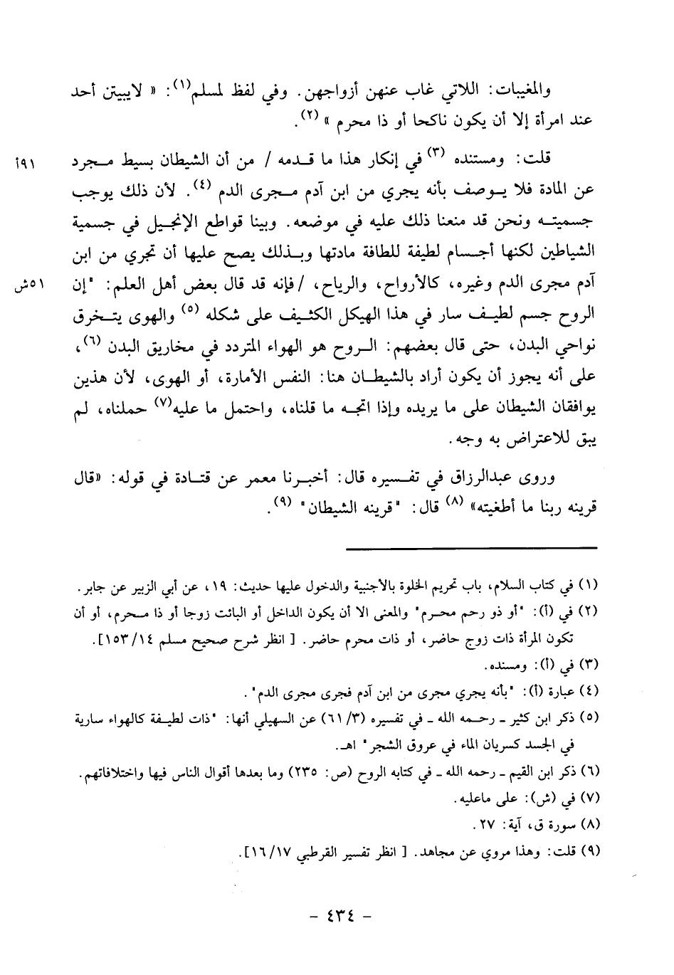 قلت: ومستنده «3» في إنكار هذا ما قدمه/ من أن الشيطان بسيط مجرد عن المادة فلا يوصف بأنه يجري من ابن آدم مجرى الدم «4». لأن ذلك يوجب جسميته ونحن قد منعنا ذلك عليه في موضعه. وبينا قواطع الإنجيل في جسمية الشياطين لكنها أجسام لطيفة للطافة مادتها وبذلك يصح عليها أن تجري من ابن آدم مجرى الدم وغيره، كالأرواح، والرياح،/ فإنه قد قال بعض أهل العلم:" إن الروح جسم لطيف سار في هذا الهيكل الكثيف على شكله «5» والهوى يتخرق نواحي البدن، حتى قال بعضهم: الروح هو الهواء المتردد في مخاريق البدن «6»، على أنه يجوز أن يكون أراد بالشيطان هنا: النفس الأمارة، أو الهوى، لأن هذين يوافقان الشيطان على ما يريده وإذا اتجه ما قلناه، واحتمل ما عليه «7» حملناه، لم يبق للاعتراض به وجه.