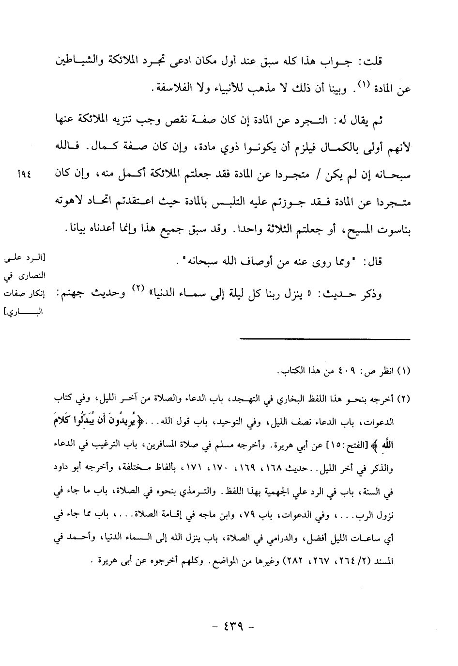 [الرد على النصارى في إنكار صفات الباري سبحانه]