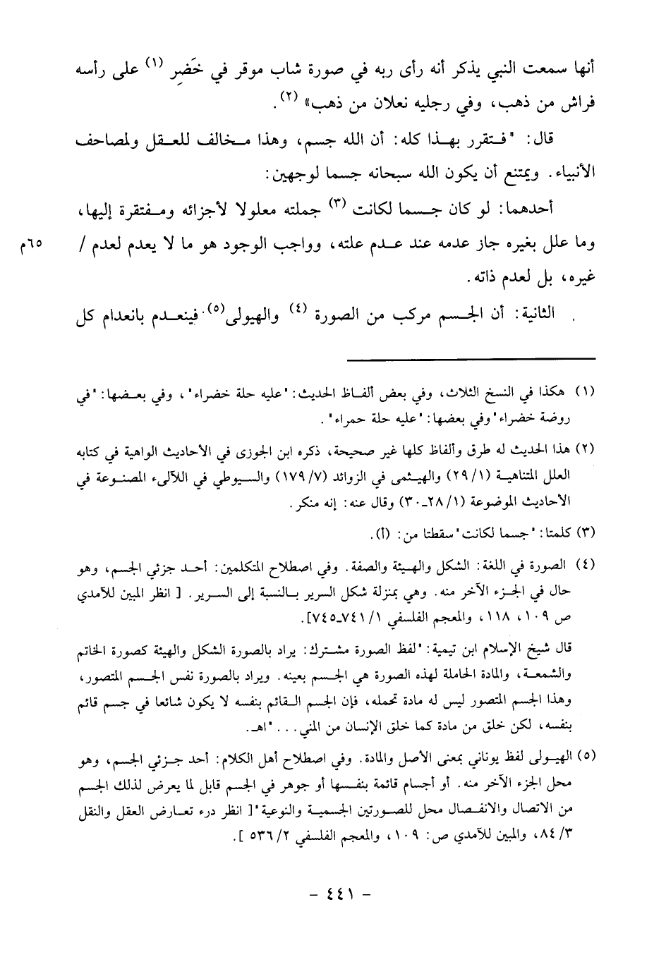 (5) الهيولى لفظ يوناني بمعنى الأصل والمادة. وفي اصطلاح أهل الكلام: أحد جزئي الجسم، وهو محل الجزء الآخر منه. أو أجسام قائمة بنفسها أو جوهر في الجسم قابل لما يعرض لذلك الجسم من الاتصال والانفصال محل للصورتين الجسمية والنوعية" [انظر درء تعارض العقل والنقل 3/ 84، والمبين للآمدي ص: 109، والمعجم الفلسفي 2/ 536].