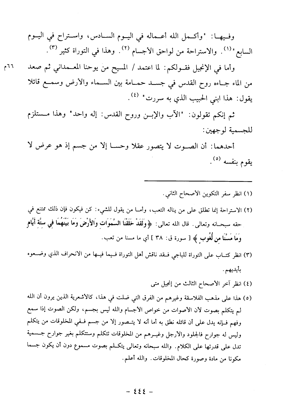 وفيها:" وأكمل الله أعماله في اليوم السادس، واستراح في اليوم السابع" «1». والاستراحة من لواحق الأجسام «2». وهذا في التوراة كثير «3».