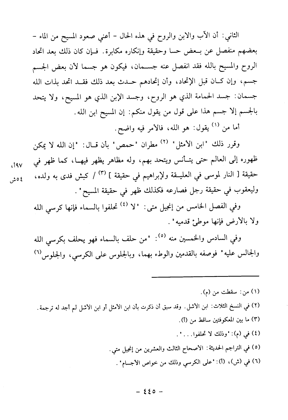 الثاني: أن الأب والابن والروح في هذه الحال- أعني صعود المسيح من الماء- بعضهم منفصل عن بعض حسا وحقيقة وإنكاره مكابرة. فإن كان ذلك بعد اتحاد الروح والمسيح بالله فقد انفصل عنه جسمان، فيكون هو جسما لأن بعض الجسم جسم، وإن كان قبل الاتحاد، وأن اتحادهم حدث بعد ذلك فقد اتحد بذات الله جسمان: جسد الحمامة الذي هو الروح، وجسد الابن الذي هو المسيح، ولا يتحد بالجسم إلا جسم هذا على قول من يقول منكم: إن المسيح ابن الله.