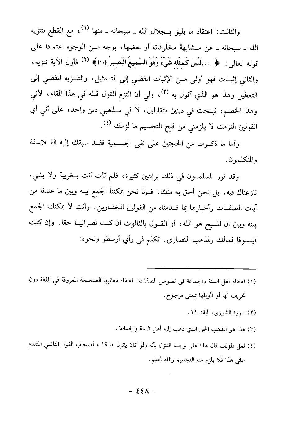 والثالث: اعتقاد ما يليق بجلال الله- سبحانه- منها «1»، مع القطع بتنزيه الله- سبحانه- عن مشابهة مخلوقاته أو بعضها، بوجه من الوجوه اعتمادا على قوله تعالى: ... لَيْسَ كَمِثْلِهِ شَيْءٌ وهُوَ السَّمِيعُ الْبَصِيرُ (11) «2» فأول الآية تنزيه، والثاني إثبات فهو أولى من الإثبات المفضي إلى التمثيل، والتنزيه المفضي إلى التعطيل وهذا هو الذي أقول به «3»، ولي أن التزم القول قبله في هذا المقام، لأني وهذا الخصم، نبحث في دينين متقابلين، لا في مذهبي دين واحد، على أني أي القولين التزمت لا يلزمني من قبح التجسيم ما لزمك «4».