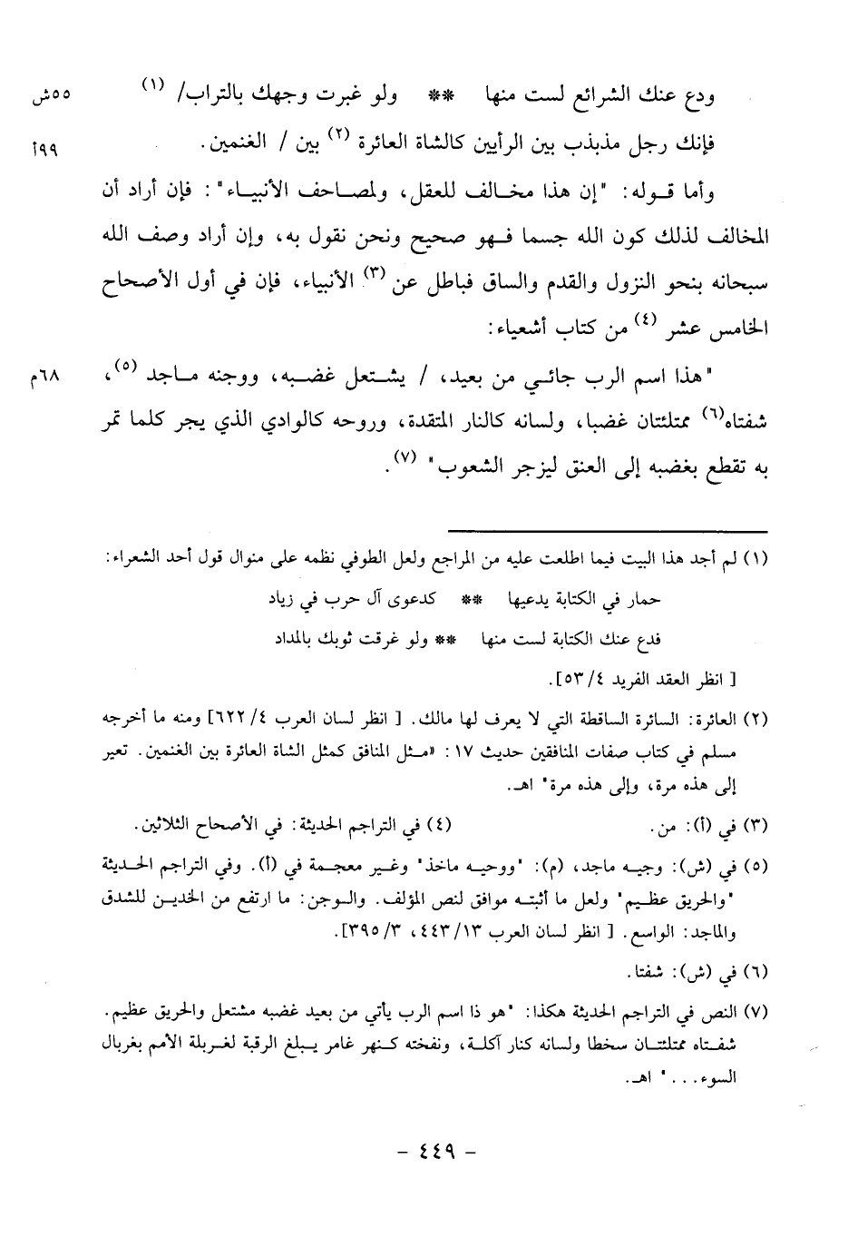 وأما قوله:" إن هذا مخالف للعقل، ولمصاحف الأنبياء": فإن أراد أن المخالف لذلك كون الله جسما فهو صحيح ونحن نقول به، وإن أراد وصف الله سبحانه بنحو النزول والقدم والساق فباطل عن «3» الأنبياء، فإن في أول الأصحاح الخامس عشر «4» من كتاب أشعياء: