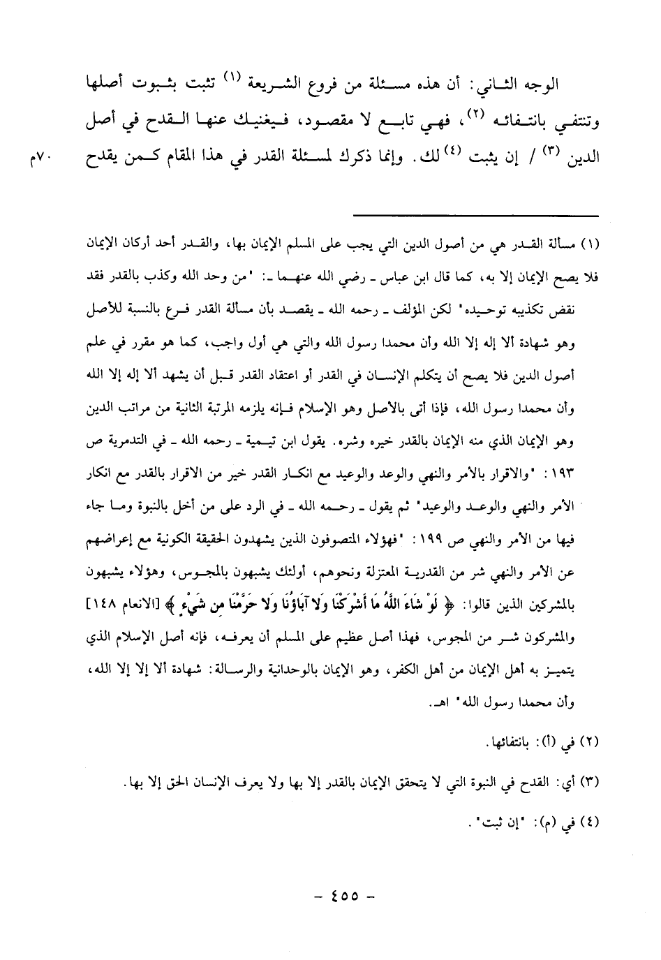 (1) مسألة القدر هي من أصول الدين التي يجب على المسلم الإيمان بها، والقدر أحد أركان الإيمان فلا يصح الإيمان إلا به، كما قال ابن عباس- رضي الله عنهما-:" من وحد الله وكذب بالقدر فقد نقض تكذيبه توحيده" لكن المؤلف- رحمه الله- يقصد بأن مسألة القدر فرع بالنسبة للأصل وهو شهادة ألا إله إلا الله وأن محمدا رسول الله والتي هي أول واجب، كما هو مقرر في علم أصول الدين فلا يصح أن يتكلم الإنسان في القدر أو اعتقاد القدر قبل أن يشهد ألا إله إلا الله وأن محمدا رسول الله، فإذا أتى بالأصل وهو الإسلام فإنه يلزمه المرتبة الثانية من مراتب الدين وهو الإيمان الذي منه الإيمان بالقدر خيره وشره. يقول ابن تيمية- رحمه الله- في التدمرية ص 193:" والاقرار بالأمر والنهي والوعد والوعيد مع انكار القدر خير من الاقرار بالقدح مع انكار الأمر والنهي والوعد والوعيد" ثم يقول- رحمه الله- في الرد على من أهل أخل بالنبوة وما جاء فيها من الأمر والنهي ص 199:" فهؤلاء المتصوفون الذين يشهدون الحقيقة الكونية مع إعراضهم عن الأمر والنهي شر من القدرية المعتزلة ونحوهم، أولئك يشبهون بالمجوس، وهؤلاء يشبهون بالمشركين الذين قالوا: لَوْ شاءَ اللَّهُ ما أَشْرَكْنا ولا آباؤُنا ولا حَرَّمْنا مِنْ شَيْءٍ [الانعام 148] والمشركون شر من المجوس، فهذا أصل عظيم على المسلم أن يعرفه، فإنه أصل الإسلام الذي يتميز به أهل الإيمان من أهل الكفر، وهو الإيمان بالوحدانية والرسالة: شهادة ألا إلا إلا الله، وأن محمدا رسول الله" اهـ.