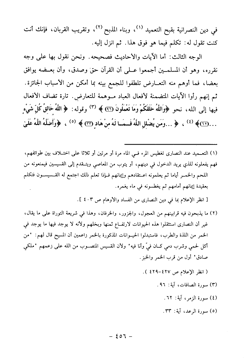 الوجه الثالث: أما الآيات والأحاديث فصحيحه. ونحن نقول بها على وجه نقرره، وهو أن المسلمين أجمعوا على أن القرآن حق وصدق، وأن بعضه يوافق بعضا، فما أوهم منه التعارض تلطفوا للجميع بينه بما أمكن من الأسباب الجائزة.