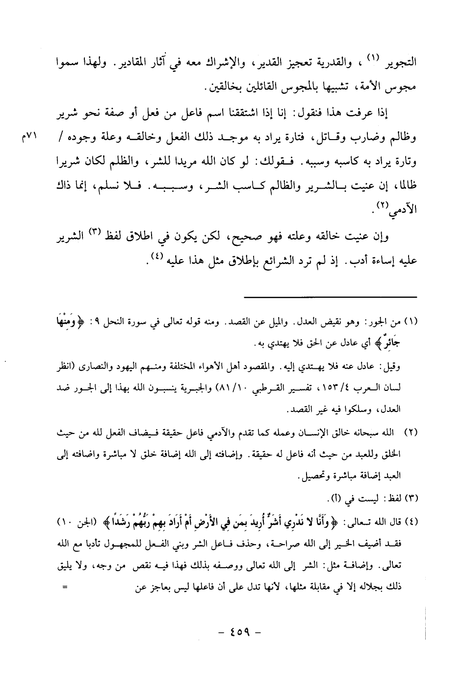 وإن عنيت خالقه وعلته فهو صحيح، لكن يكون في اطلاق لفظ «3» الشرير عليه إساءة أدب. إذ لم ترد الشرائع بإطلاق مثل هذا عليه «4».