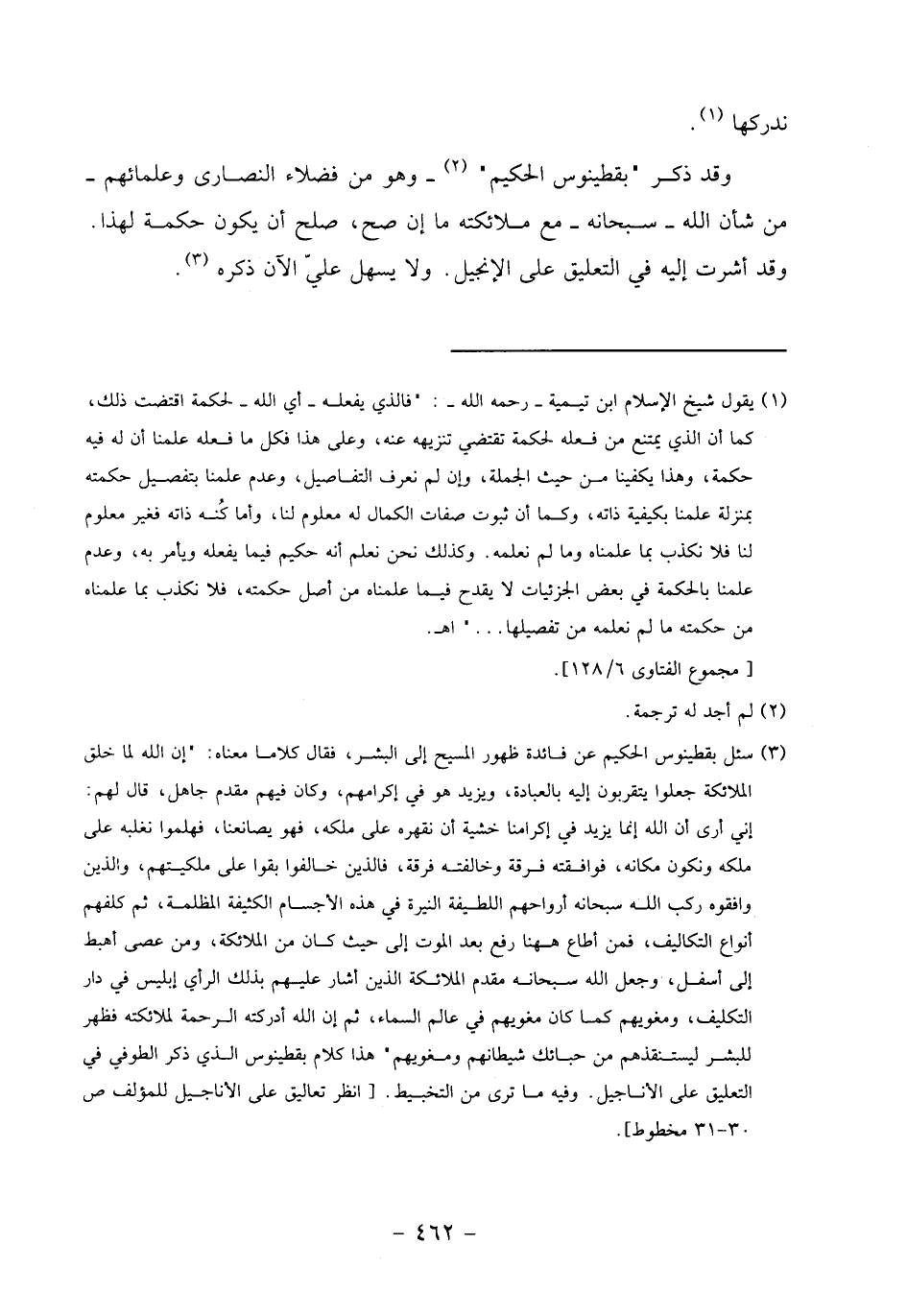 (3) سئل بقطينوس الحكيم عن فائدة ظهور المسيح إلى البشر، فقال كلاما معناه:" إن الله لما خلق الملائكة جعلوا يتقربون إليه بالعبادة، ويزيد هو في إكرامهم، وكان فيهم مقدم جاهل، قال لهم: