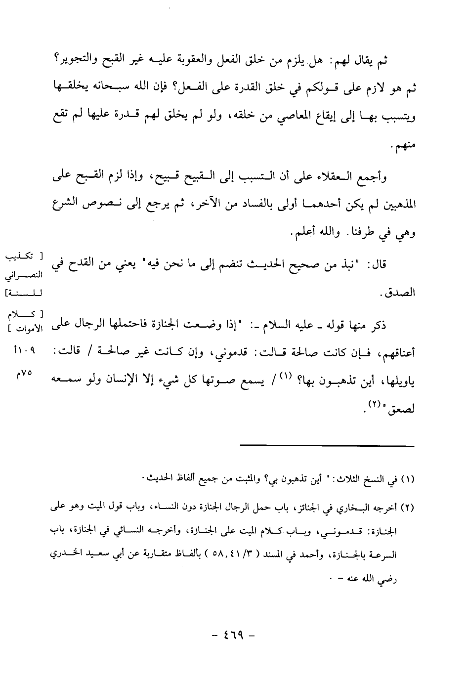 (2) أخرجه البخاري في الجنائز، باب حمل الرجال الجنازة دون النساء، وباب قول الميت وهو على الجنازة: قدموني، وباب كلام الميت على الجنازة، وأخرجه النسائي في الجنازة، باب السرعة بالجنازة، وأحمد في المسند (3/ 41، 58) بألفاظ متقاربة عن أبي سعيد الخدري رضي الله عنه-.