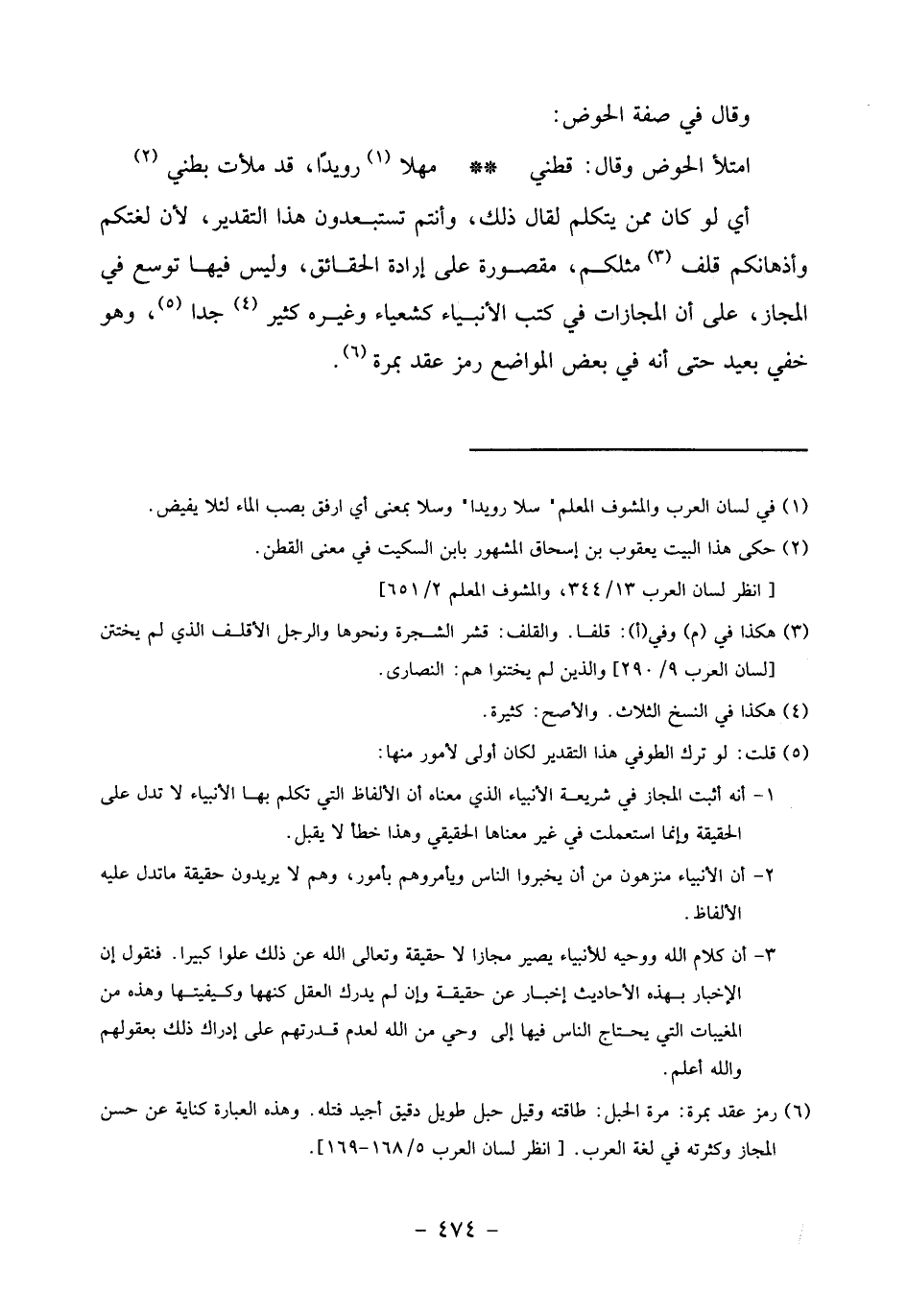 امتلأ الحوض وقال: قطني مهلا «1» رويدا، قد ملأت بطني «2» أي لو كان ممن يتكلم لقال ذلك، وأنتم تستبعدون هذا التقدير، لأن لغتكم وأذهانكم قلف «3» مثلكم، مقصورة على إرادة الحقائق، وليس فيها توسع في المجاز، على أن المجازات في كتب الأنبياء كشعياء وغيره كثير «4» جدا «5»، وهو خفي بعيد حتى أنه في بعض المواضع رمز عقد بمرة «6».