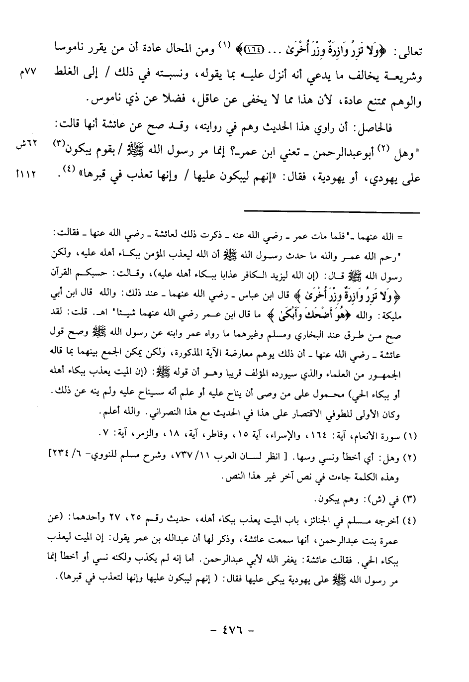 (4) أخرجه مسلم في الجنائز، باب الميت يعذب ببكاء أهله، حديث رقم 25، 27 وأحدهما: (عن عمرة بنت عبد الرحمن، أنها سمعت عائشة، وذكر لها أن عبد الله بن عمر يقول: إن الميت ليعذب ببكاء الحي. فقالت عائشة: يغفر الله لأبي عبد الرحمن. أما إنه لم يكذب ولكنه نسي أو أخطأ إنما مر رسول الله صلّى الله عليه وسلّم على يهودية يبكى عليها فقال: (إنهم ليبكون عليها وإنها لتعذب في قبرها).