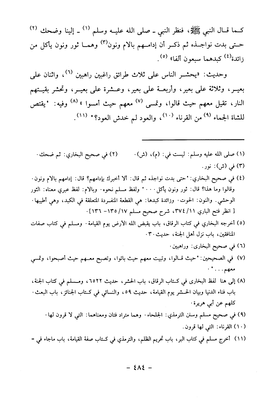 (8) إلى هنا لفظ البخاري في كتاب الرقاق، باب الحشر، حديث 6522، ومسلم في كتاب الجنة، باب فناء الدنيا وبيان الحشر يوم القيامة، حديث 59، والنسائي في كتاب الجنائز، باب البعث. كلهم عن أبي هريرة.