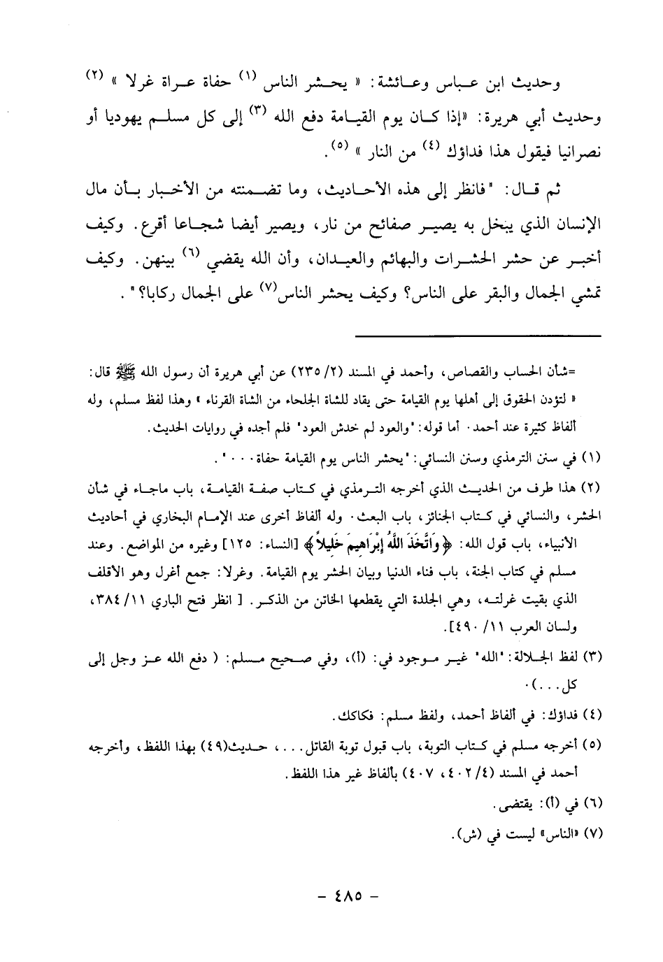 ثم قال:" فانظر إلى هذه الأحاديث، وما تضمنته من الأخبار بأن مال الإنسان الذي يبخل به يصير صفائح من نار، ويصير أيضا شجاعا أقرع. وكيف أخبر عن حشر الحشرات والبهائم والعيدان، وأن الله يقتضي «6» بينهن. وكيف تمشي الجمال والبقر على الناس؟ وكيف يحشر الناس «7» على الجمال ركابا؟ ".