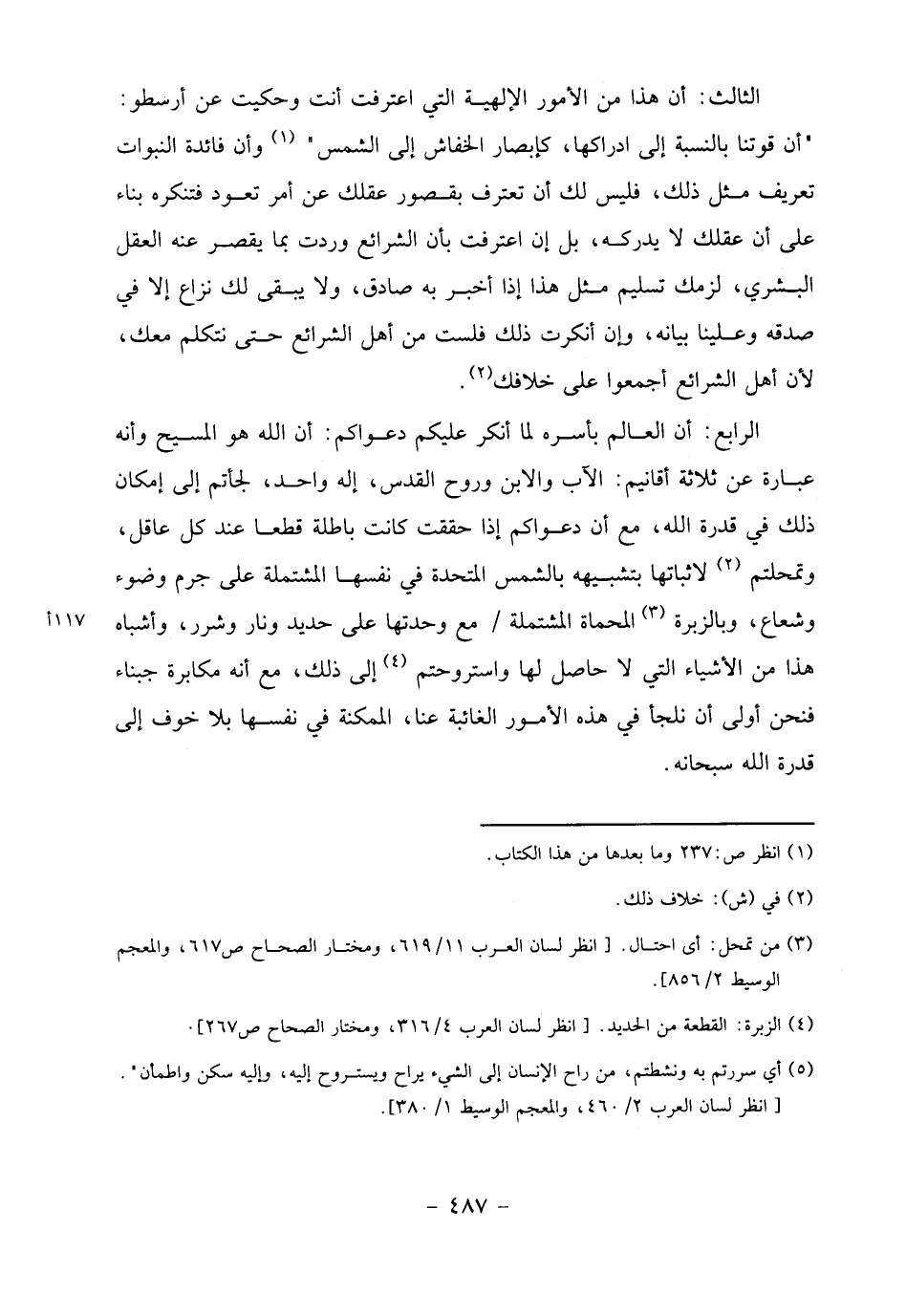 الرابع: أن العالم بأسره لما أنكر عليكم دعواكم: أن الله هو المسيح وأنه عبارة عن ثلاثة أقانيم: الأب والابن وروح القدس، إله واحد، لجأتم إلى إمكان ذلك في قدرة الله، مع أن دعواكم إذا حققت كانت باطلة قطعا عند كل عاقل، وتمحلتم «3» لاثباتها بتشبيهه بالشمس المتحدة في نفسها المشتملة على جرم وضوء وشعاع، وبالزبرة «4» المحماة المشتملة/ مع وحدتها على حديد ونار وشرر، وأشباه هذا من الأشياء التي لا حاصل لها واستروحتم «5» إلى ذلك، مع أنه مكابرة جبناء فنحن أولى أن نلجأ في هذه الأمور الغائبة عنا، الممكنة في نفسها بلا خوف إلى قدرة الله سبحانه.