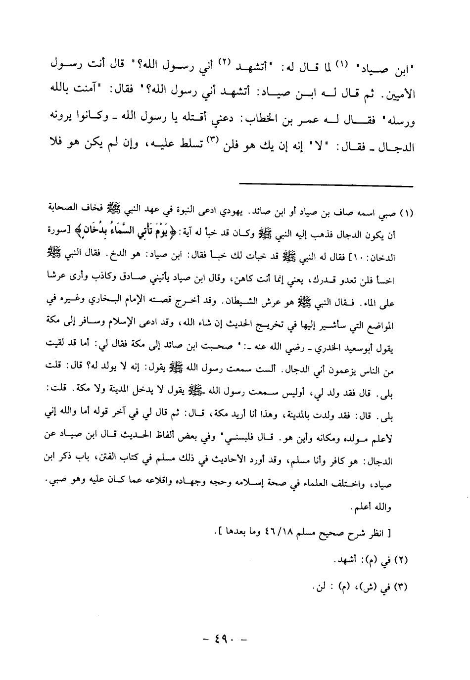 " ابن صياد" «1» لما قال له:" أتشهد «2» أني رسول الله؟ " قال أنت رسول الأميين. ثم قال له ابن صياد: أتشهد أني رسول الله؟ " فقال:" آمنت بالله ورسله" فقال له عمر بن الخطاب: دعني أقتله يا رسول الله- وكانوا يرونه الدجال- فقال:" لا" إنه إن يك هو فلن «3» تسلط عليه، وإن لم يكن هو فلا