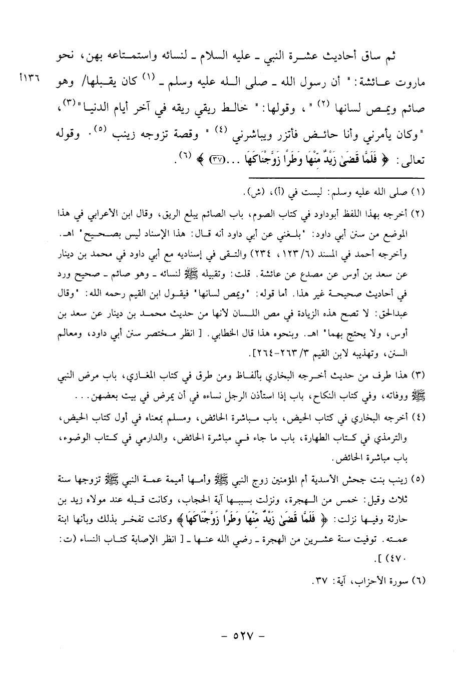 ثم ساق أحاديث عشرة النبي- عليه السلام- لنسائه واستمتاعه بهن، نحو ماروت عائشة:" أن رسول الله- صلى الله عليه وسلم- «1» كان يقبلها/ وهو صائم ويمص لسانها «2» "، وقولها:" خالط ريقي ريقه في آخر أيام الدنيا" «3»،" وكان يأمرني وأنا حائض فأتزر ويباشرني «4» " وقصة تزوجه زينب «5». وقوله تعالى: فَلَمَّا قَضى زَيْدٌ مِنْها وَطَراً زَوَّجْناكَها ... (37) «6».