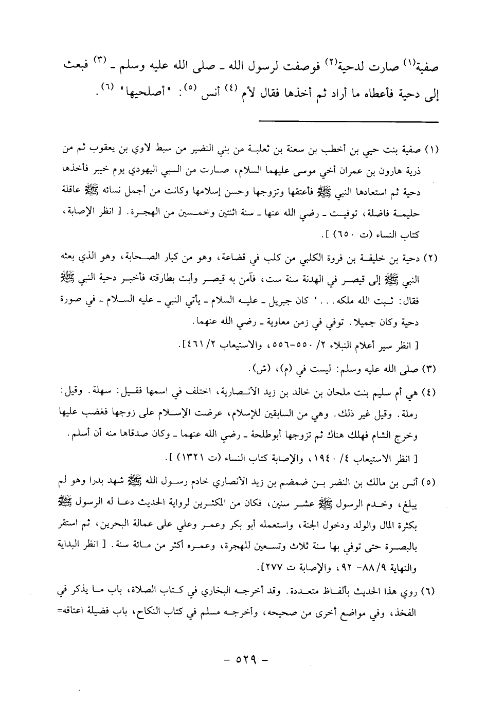 صفية «1» صارت لدحية «2» فوصفت لرسول الله- صلى الله عليه وسلم- «3» فبعث إلى دحية فأعطاه ما أراد ثم أخذها فقال لأم «4» أنس «5»:" أصلحيها" «6».