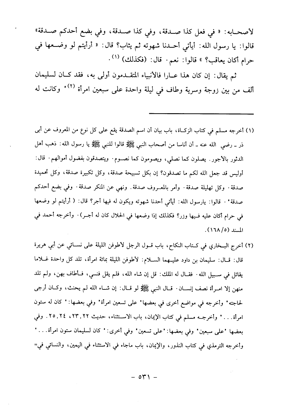 لأصحابه: «في فعل كذا صدقة، وفي كذا صدقة، وفي بضع أحدكم صدقة» قالوا: يا رسول الله: أيأتي أحدنا شهوته ثم يثاب؟ قال: «أرأيتم لو وضعها في حرام أكان يعاقب؟» قالوا: نعم. قال: (فكذلك) «1».