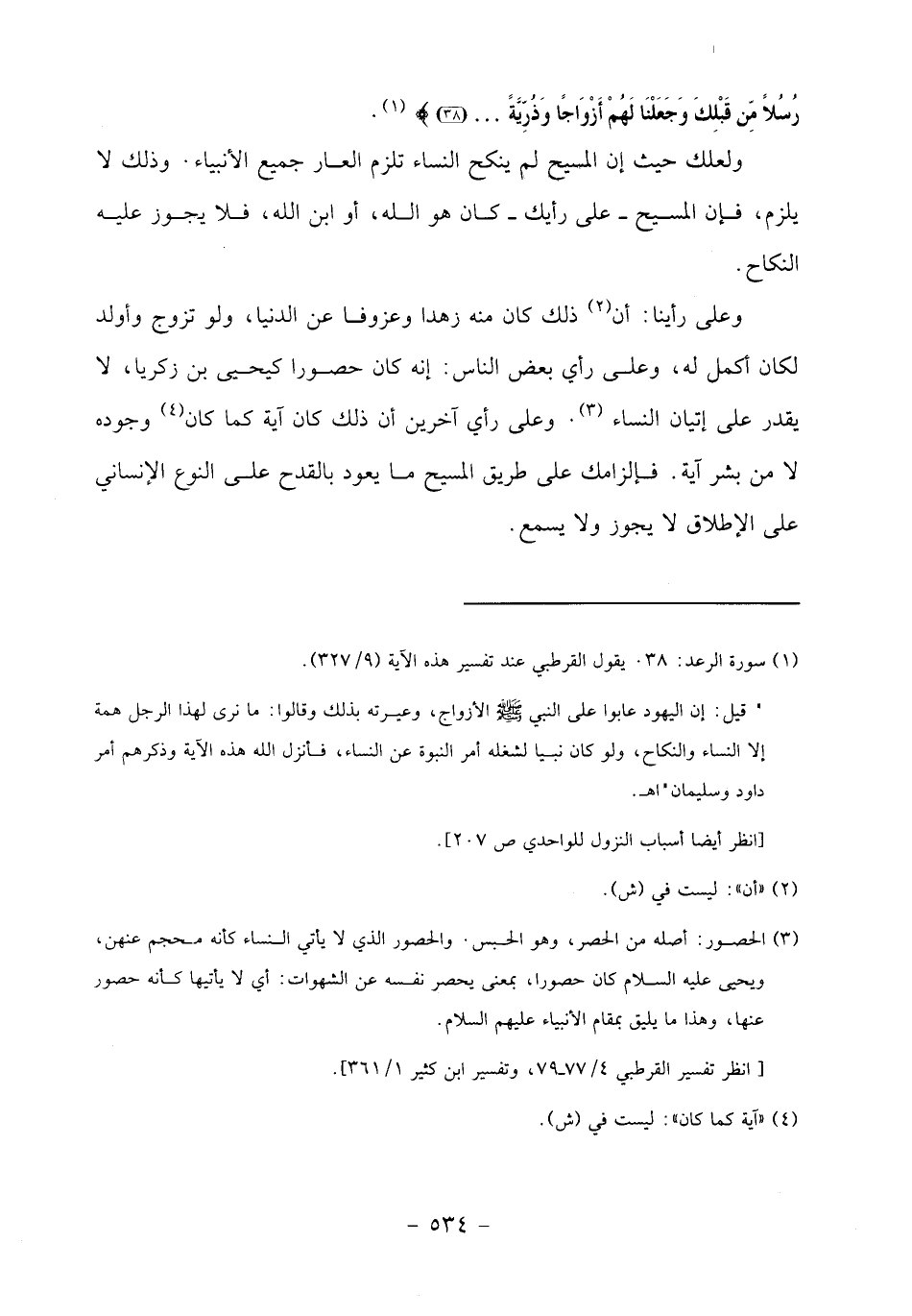 وعلى رأينا: أن «2» ذلك كان منه زهدا وعزوفا عن الدنيا، ولو تزوج وأولد لكان أكمل له، وعلى رأي بعض الناس: إنه كان حصورا كيحيى بن زكريا، لا يقدر على إتيان النساء «3». وعلى رأي آخرين أن ذلك كان آية كما كان «4» وجوده لا من بشر آية. فإلزامك على طريق المسيح ما يعود بالقدح على النوع الإنساني على الإطلاق لا يجوز ولا يسمع.
