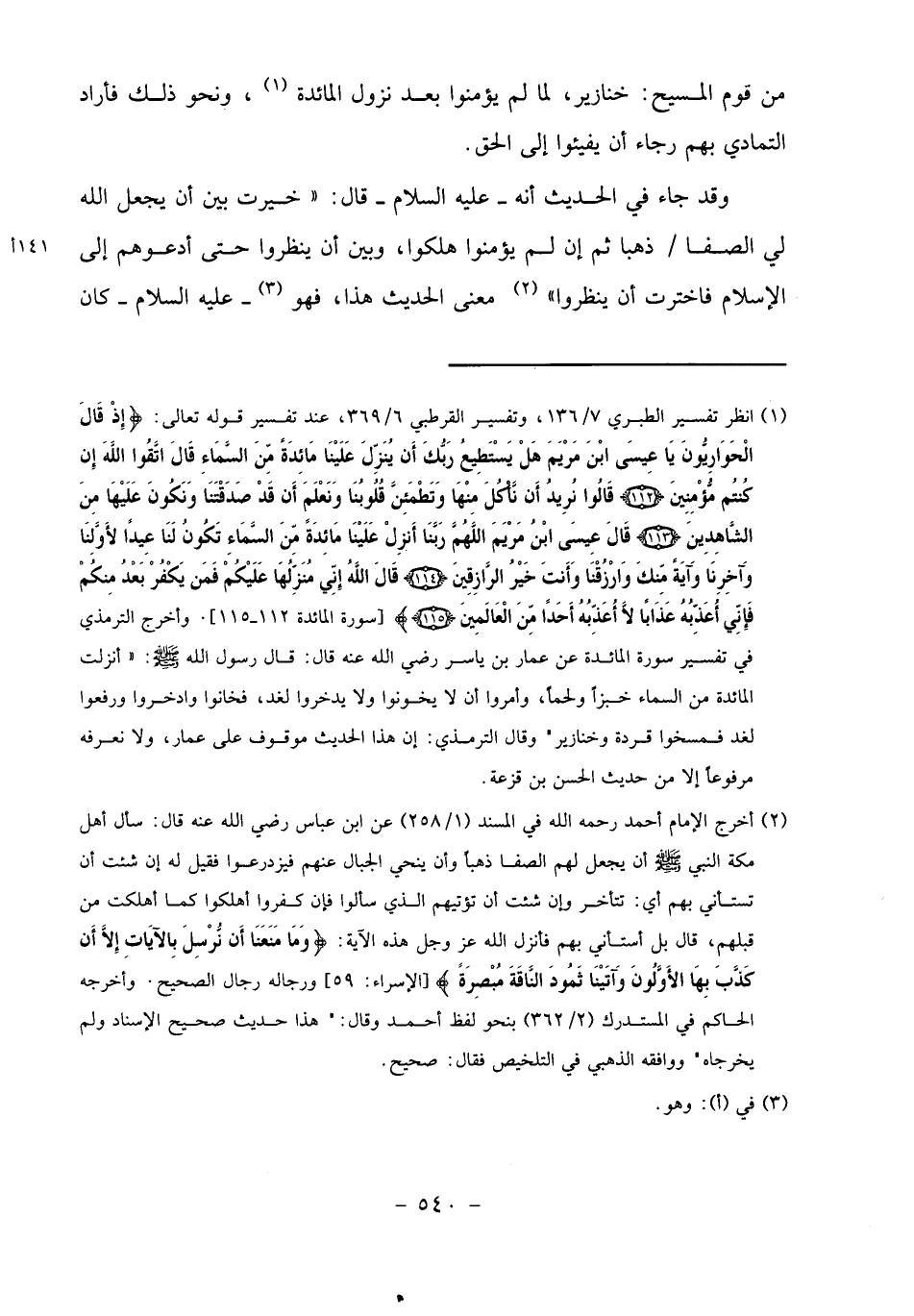 (1) انظر تفسير الطبري 7/ 136، وتفسير القرطبي 6/ 369، عند تفسير قوله تعالى: إِذْ قالَ الْحَوارِيُّونَ يا عِيسَى ابْنَ مَرْيَمَ هَلْ يَسْتَطِيعُ رَبُّكَ أَنْ يُنَزِّلَ عَلَيْنا مائِدَةً مِنَ السَّماءِ قالَ اتَّقُوا اللَّهَ إِنْ كُنْتُمْ مُؤْمِنِينَ (112) قالُوا نُرِيدُ أَنْ نَأْكُلَ مِنْها وتَطْمَئِنَّ قُلُوبُنا ونَعْلَمَ أَنْ قَدْ صَدَقْتَنا ونَكُونَ عَلَيْها مِنَ الشَّاهِدِينَ (113) قالَ عِيسَى ابْنُ مَرْيَمَ اللَّهُمَّ رَبَّنا أَنْزِلْ عَلَيْنا مائِدَةً مِنَ السَّماءِ تَكُونُ لَنا عِيداً لِأَوَّلِنا وآخِرِنا وآيَةً مِنْكَ وارْزُقْنا وأَنْتَ خَيْرُ الرَّازِقِينَ (114) قالَ اللَّهُ إِنِّي مُنَزِّلُها عَلَيْكُمْ فَمَنْ يَكْفُرْ بَعْدُ مِنْكُمْ فَإِنِّي أُعَذِّبُهُ عَذاباً لا أُعَذِّبُهُ أَحَداً مِنَ الْعالَمِينَ (115) [سورة المائدة 112 - 115]. وأخرج الترمذي في تفسير سورة المائدة عن عمار بن ياسر رضي الله عنه قال: قال رسول الله صلى الله عليه وسلم: «أنزلت المائدة من السماء خبزا ولحما، وأمروا أن لا يخونوا ولا يدخروا لغد، فخانوا وادخروا ورفعوا لغد فمسخوا قردة وخنازير" وقال الترمذي: إن هذا الحديث موقوف على عمار، ولا نعرفه مرفوعا إلا من حديث الحسن بن قزعة.