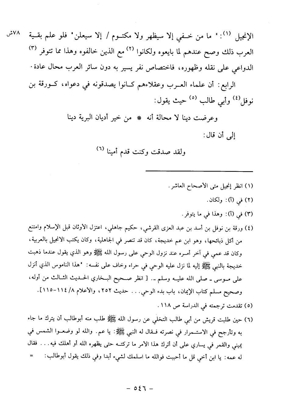 الرابع: أن علماء العرب وعقلاءهم كانوا يصدقونه في دعواه، كورقة بن نوفل «4» وأبي طالب «5» حيث يقول: