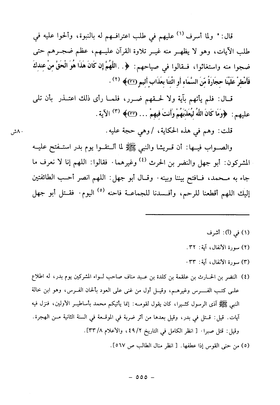 قال:" ولما أسرف «1» عليهم في طلب اعترافهم له بالنبوة، وألحوا عليه في طلب الآيات، وهو لا يظهر منه غير تلاوة القرآن عليهم، عظم ضجرهم حتى ضجوا منه واستغاثوا، فقالوا في صياحهم: .. اللَّهُمَّ إِنْ كانَ هذا هُوَ الْحَقَّ مِنْ عِنْدِكَ فَأَمْطِرْ عَلَيْنا حِجارَةً مِنَ السَّماءِ أَوِ ائْتِنا بِعَذابٍ أَلِيمٍ (32) «2».