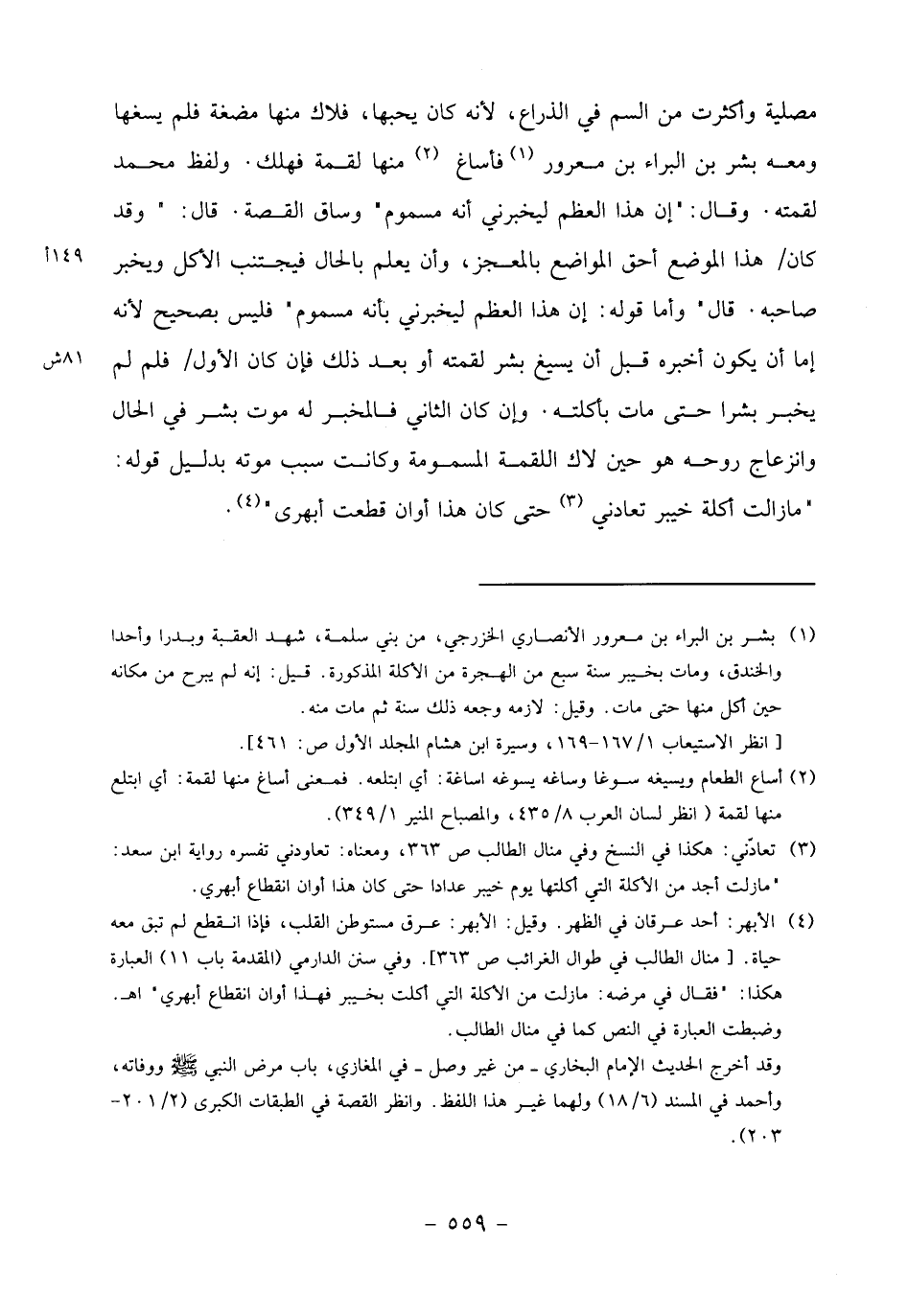 (4) الأبهر: أحد عرقان في الظهر. وقيل: الأبهر: عرق مستوطن القلب، فإذا انقطع لم تبق معه حياة. [منال الطالب في طوال الغرائب ص 363]. وفي سنن الدارمي (المقدمة باب 11) العبارة هكذا:" فقال في مرضه: ما زلت من الأكلة التي أكلت بخيبر فهذا أوان انقطاع أبهري" اهـ.