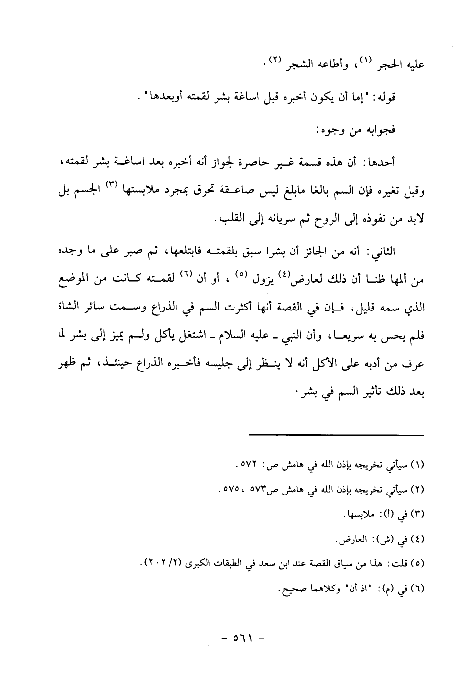 أحدها: أن هذه قسمة غير حاصرة لجواز أنه أخبره بعد اساغة بشر لقمته، وقبل تغيره فإن السم بالغا ما بلغ ليس صاعقة تحرق بمجرد ملابستها «3» الجسم بل لا بدّ من نفوذه إلى الروح ثم سريانه إلى القلب.