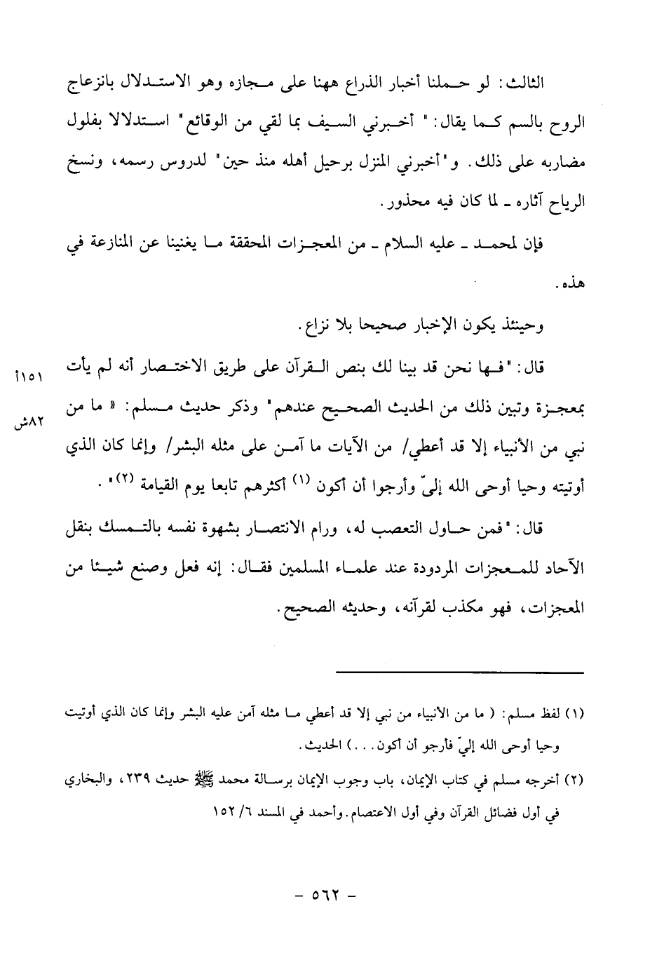 قال:" فها نحن قد بينا لك بنص القرآن على طريق الاختصار أنه لم يأت بمعجزة وتبين ذلك من الحديث الصحيح عندهم" وذكر حديث مسلم: «ما من نبي من الأنبياء إلا قد أعطي/ من الآيات ما آمن على مثله البشر/ وإنما كان الذي أوتيته وحيا أوحى الله إلى وأرجوا أن أكون «1» أكثرهم تابعا يوم القيامة «2» ".