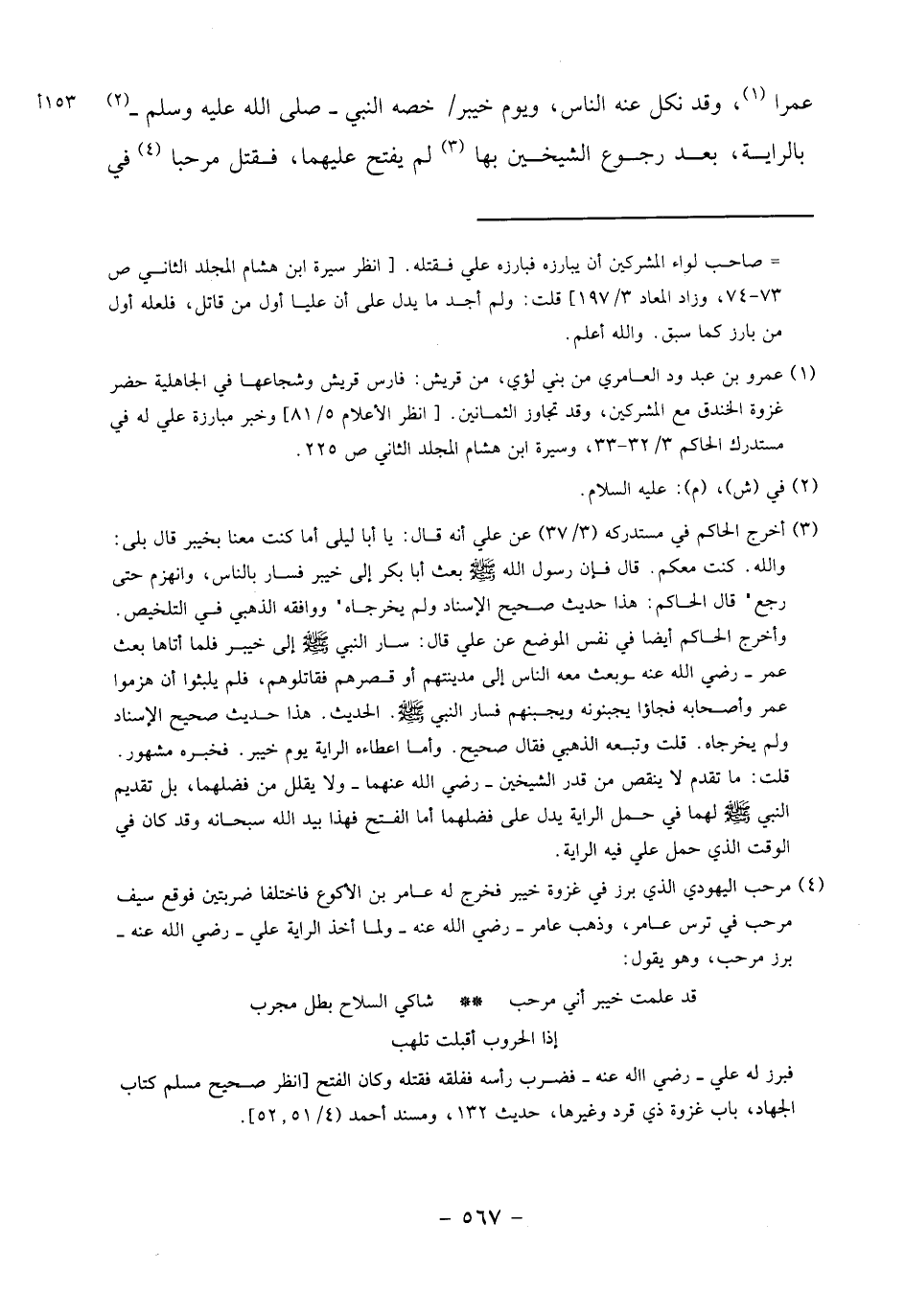 (1) عمرو بن عبد ود العامري من بني لؤي، من قريش: فارس قريش وشجاعها في الجاهلية حضر غزوة الخندق مع المشركين، وقد تجاوز الثمانين. [انظر الأعلام 5/ 81] وخبر مبارزة علي له في مستدرك الحاكم 3/ 32 - 33، وسيرة ابن هشام المجلد الثاني ص 225.