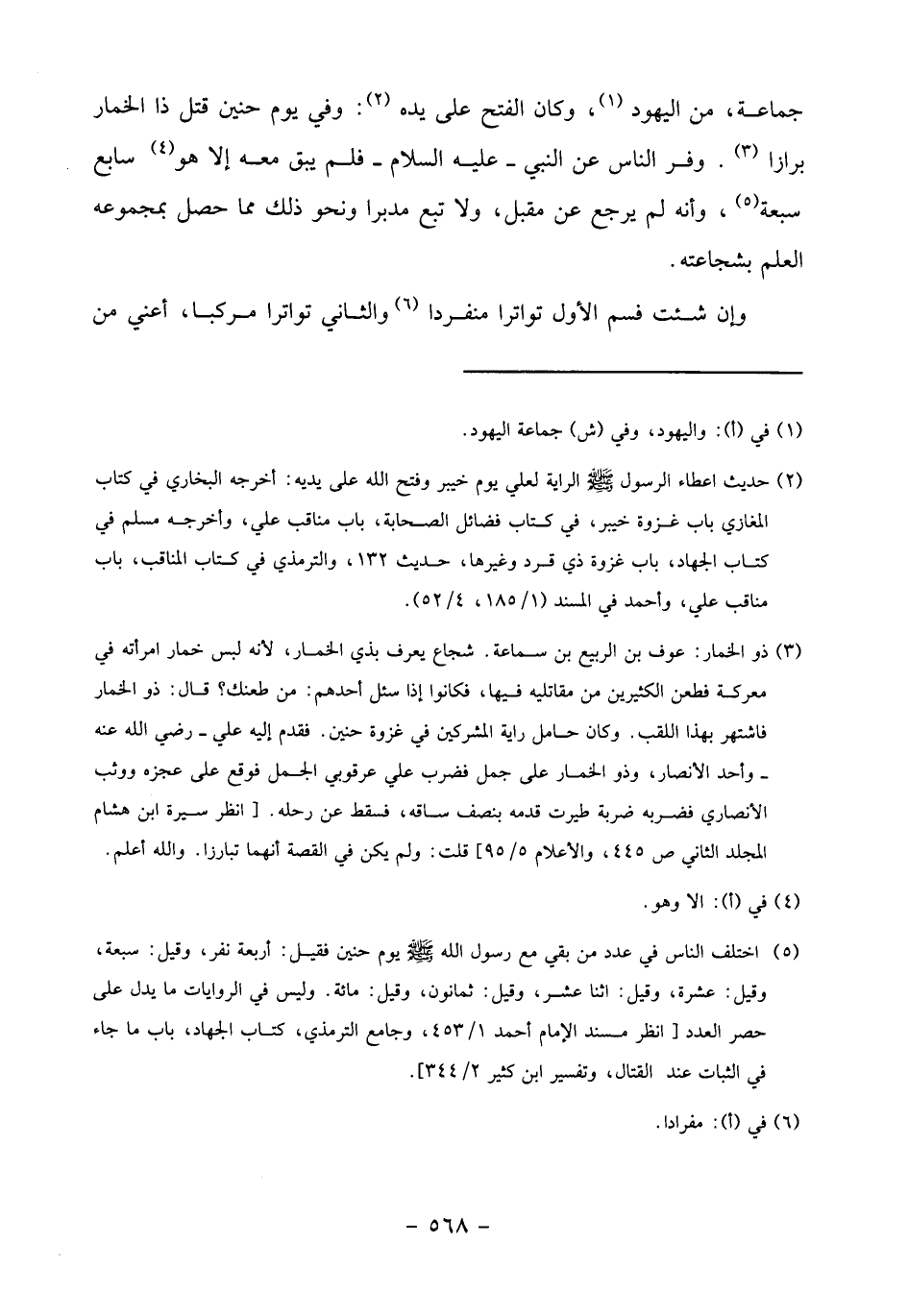 جماعة، من اليهود «1»، وكان الفتح على يده «2»: وفي يوم حنين قتل ذا الخمار برازا «3». وفر الناس عن النبي- عليه السلام- فلم يبق معه إلا هو «4» سابع سبعة «5»، وأنه لم يرجع عن مقبل، ولا تبع مدبرا ونحو ذلك مما حصل بمجموعه العلم بشجاعته.