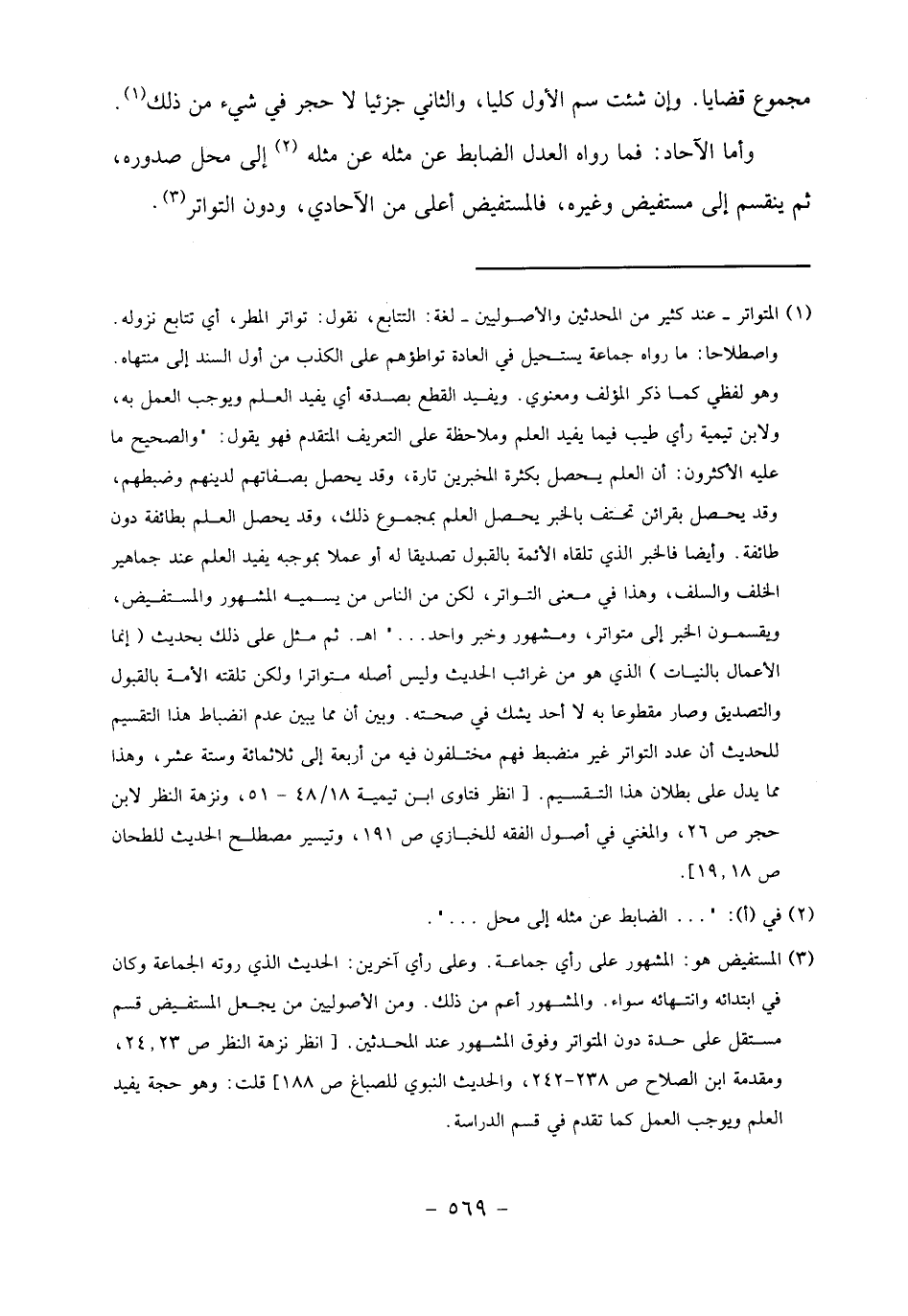 (3) المستفيض هو: المشهور على رأي جماعة. وعلى رأي آخرين: الحديث الذي روته الجماعة وكان في ابتدائه وانتهائه سواء. والمشهور أعم من ذلك. ومن الأصوليين من يجعل المستفيض قسم مستقل على حدة دون المتواتر وفوق المشهور عند المحدثين. [انظر نزهة النظر ص 23، 24، ومقدمة ابن الصلاح ص 238 - 242، والحديث النبوي للصباغ ص 188] قلت: وهو حجة يفيد العلم ويوجب العمل كما تقدم في قسم الدراسة.