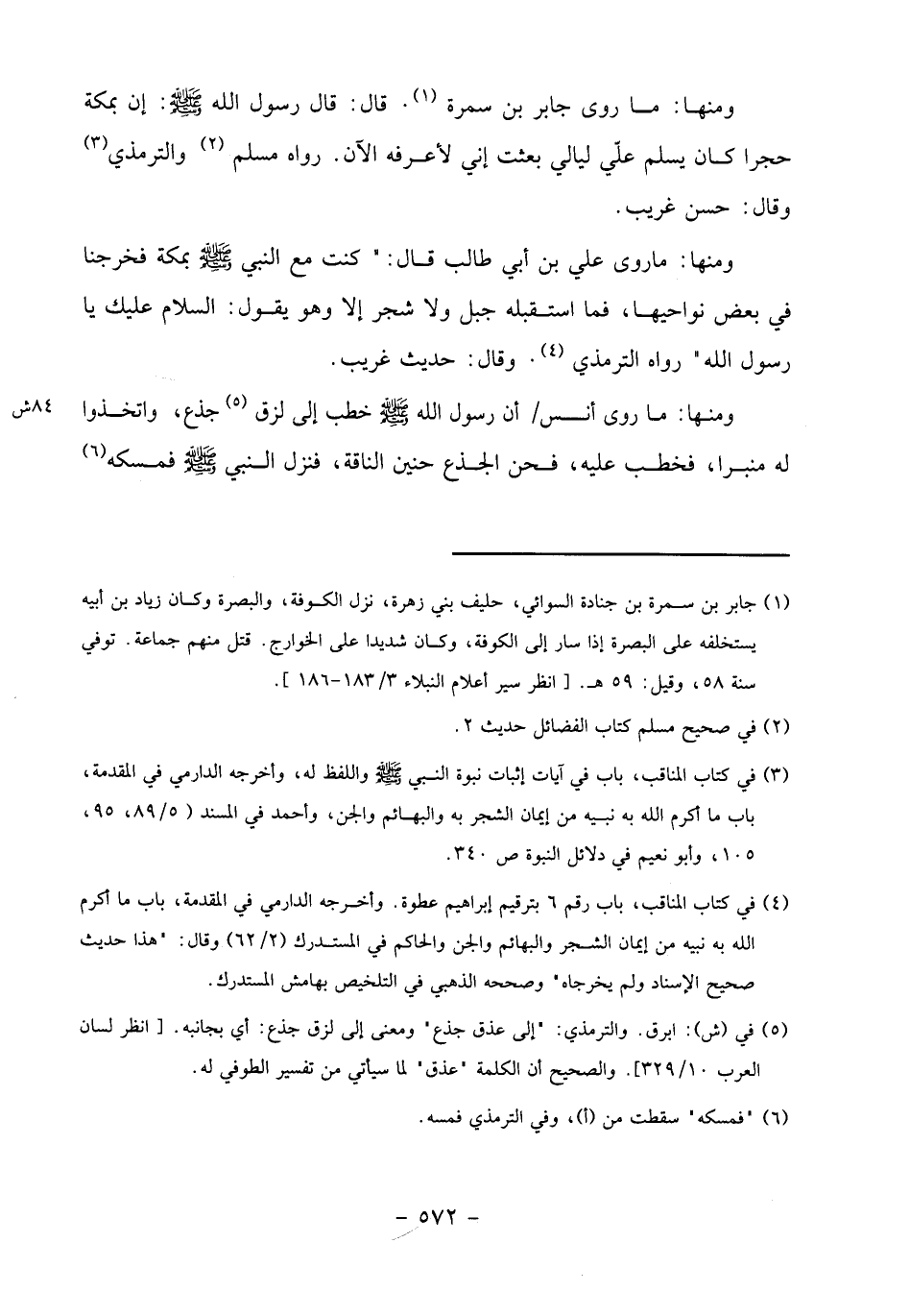 ومنها: ما روى جابر بن سمرة «1». قال: قال رسول الله صلى الله عليه وسلم: إن بمكة حجرا كان يسلم عليّ ليالي بعثت إني لأعرفه الآن. رواه مسلم «2» والترمذي «3» وقال: حسن غريب.