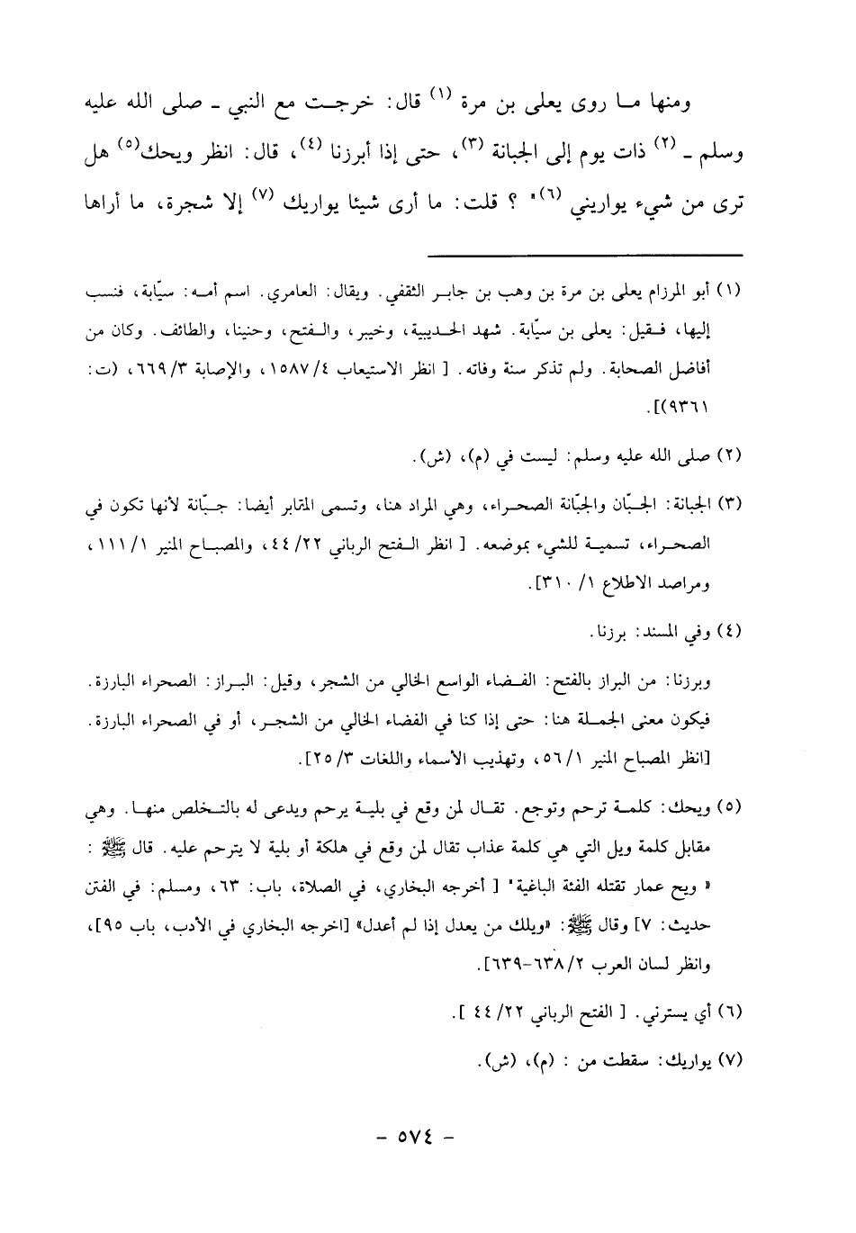 ومنها ما روى يعلى بن مرة «1» قال: خرجت مع النبي- صلى الله عليه وسلم- «2» ذات يوم إلى الجبانة «3»، حتى إذا أبرزنا «4»، قال: انظر ويحك «5» هل ترى من شيء يواريني «6» "؟ قلت: ما أرى شيئا يواريك «7» إلا شجرة، ما أراها
